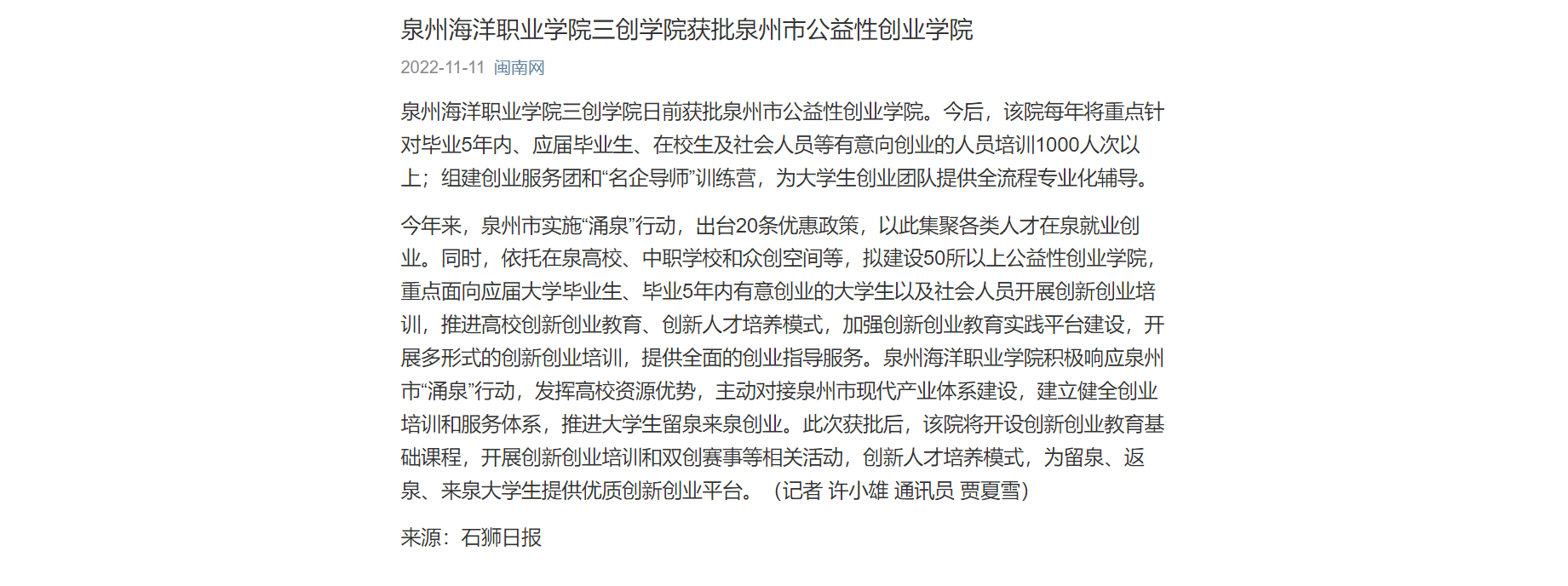 (新闻中心讯 记者许小雄供稿 校党委宣传部报道)泉州海洋职业学院三创学院日前获批泉州市公益性创业学院。今后,该院每年将重点针对毕业5年内、应届毕业生、在校生及社会人员等有意向创业的人员培训1000人次以上;组...