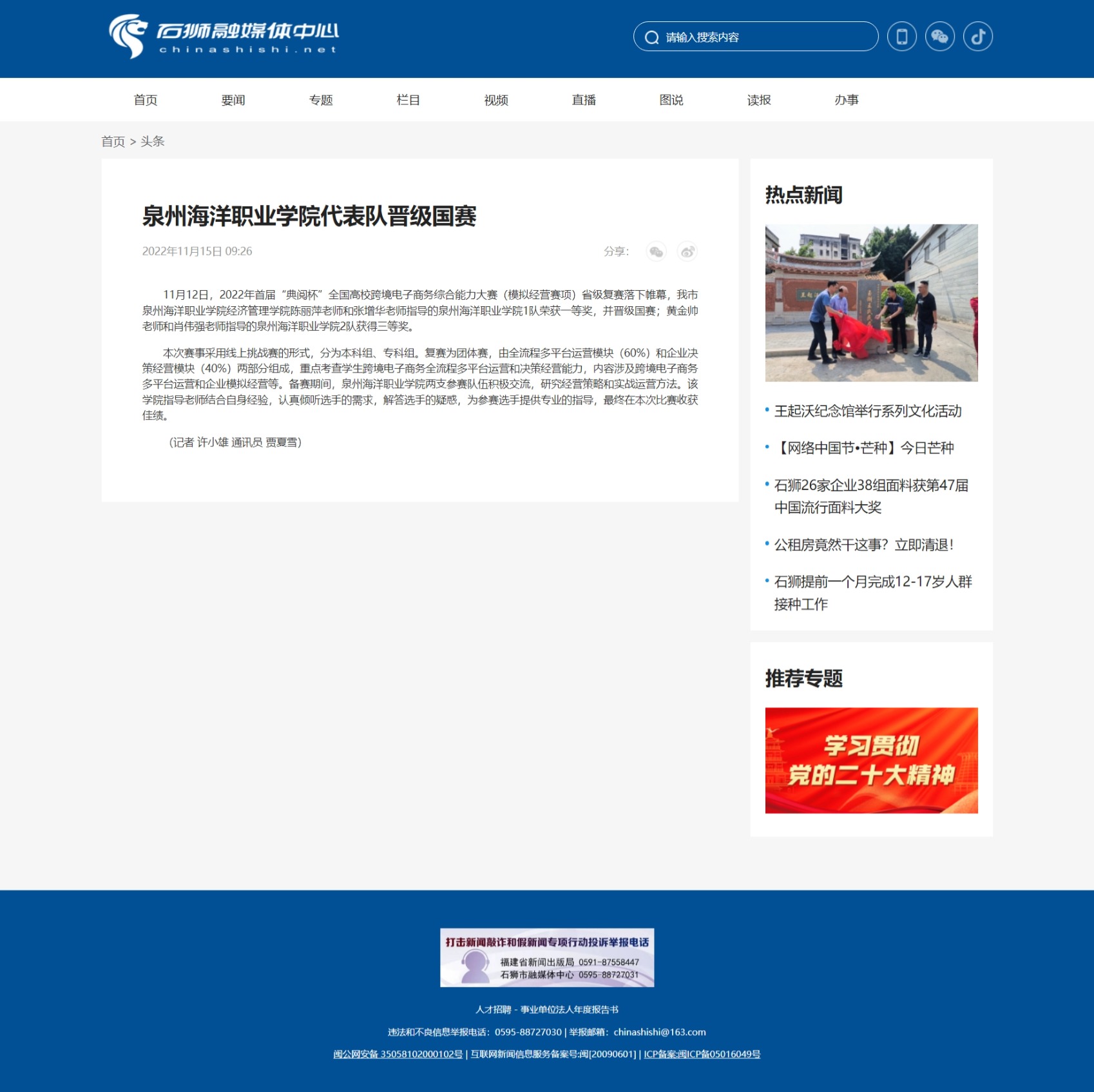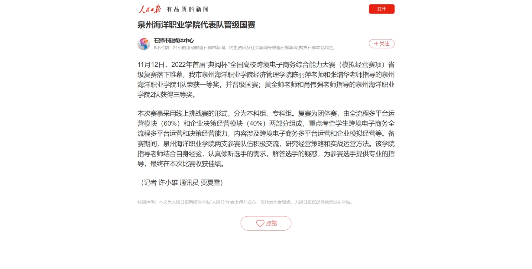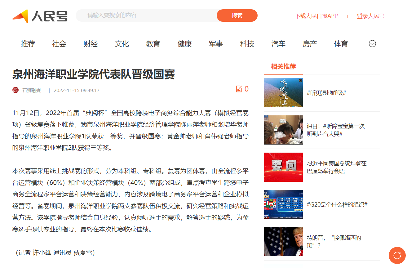 (新闻中心讯 记者许小雄供稿 校党委宣传部报道)11月12日,2022年首届“典阅杯”全国高校跨境电子商务综合能力大赛(模拟经营赛项)省级复赛落下帷幕,我市泉州海洋职业学院经济管理学院陈丽萍老师和张增华老师指导...