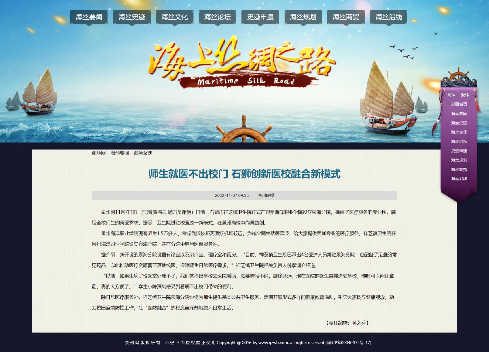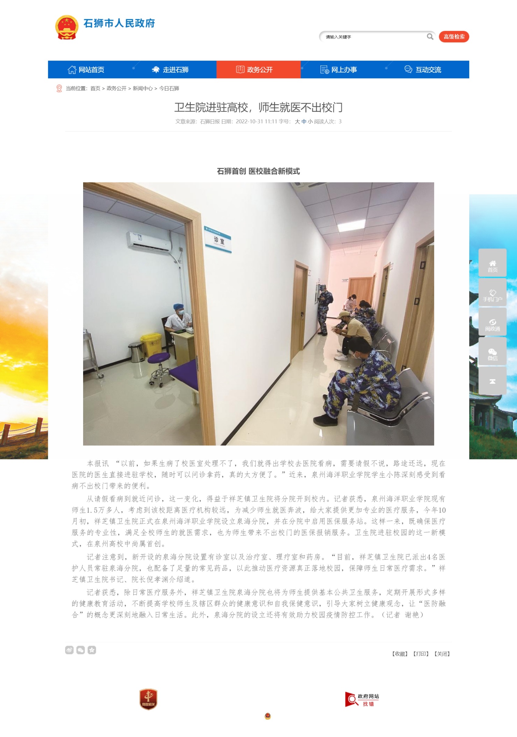 (新闻中心讯 记者詹伟志供稿 校党委宣传部报道)日前,石狮市祥芝镇卫生院正式在泉州海洋职业学院设立泉海分院,确保了医疗服务的专业性,满足全校师生的就医需求。据悉,卫生院进驻校园这一新模式,在泉州高校中尚...