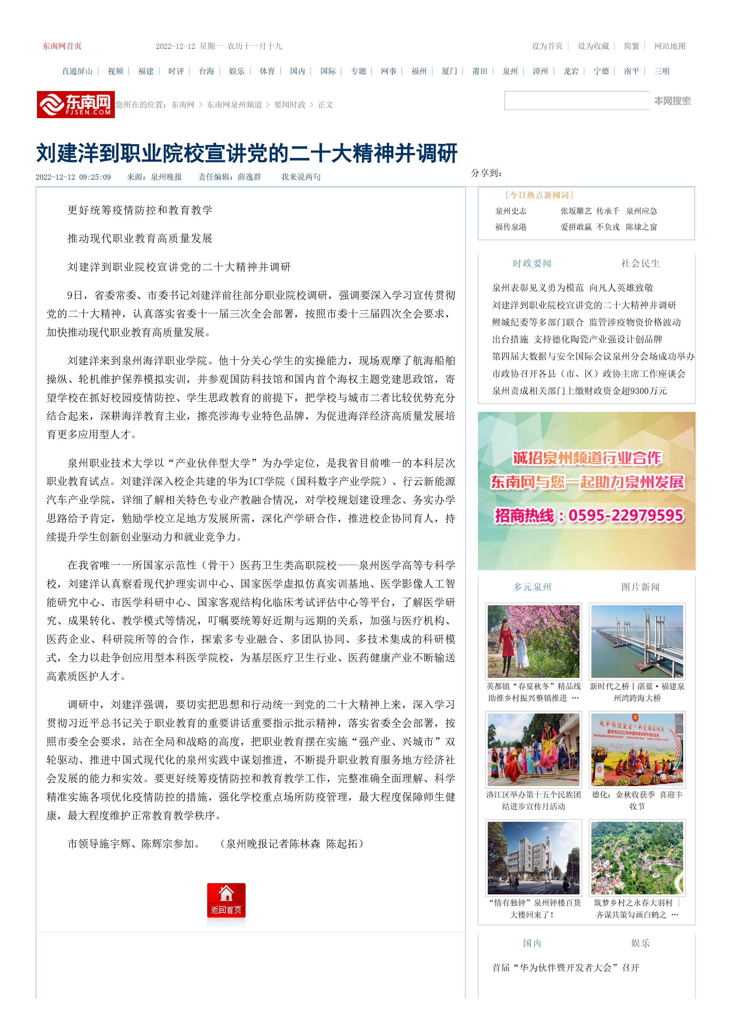 (新闻中心讯 记者陈林森供稿 校党委宣传部报道)9日,省委常委、市委书记刘建洋前往部分职业院校调研,强调要深入学习宣传贯彻党的二十大精神,认真落实省委十一届三次全会部署,按照市委十三届四次全会要求,加快推...