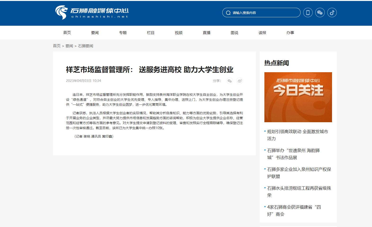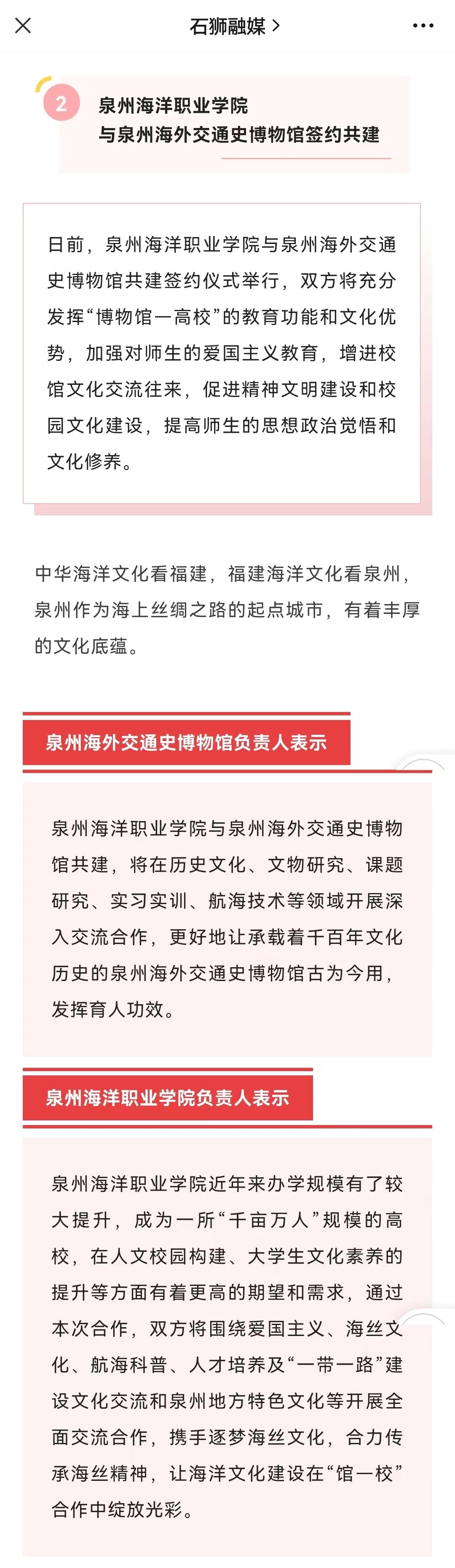 (新闻中心讯 记者许小雄供稿 校党委宣传部报道)日前,泉州海洋职业学院与泉州海外交通史博物馆共建签约仪式举行,双方将充分发挥“博物馆—高校”的教育功能和文化优势,加强对师生的爱国主义教育,增进校馆文化交...