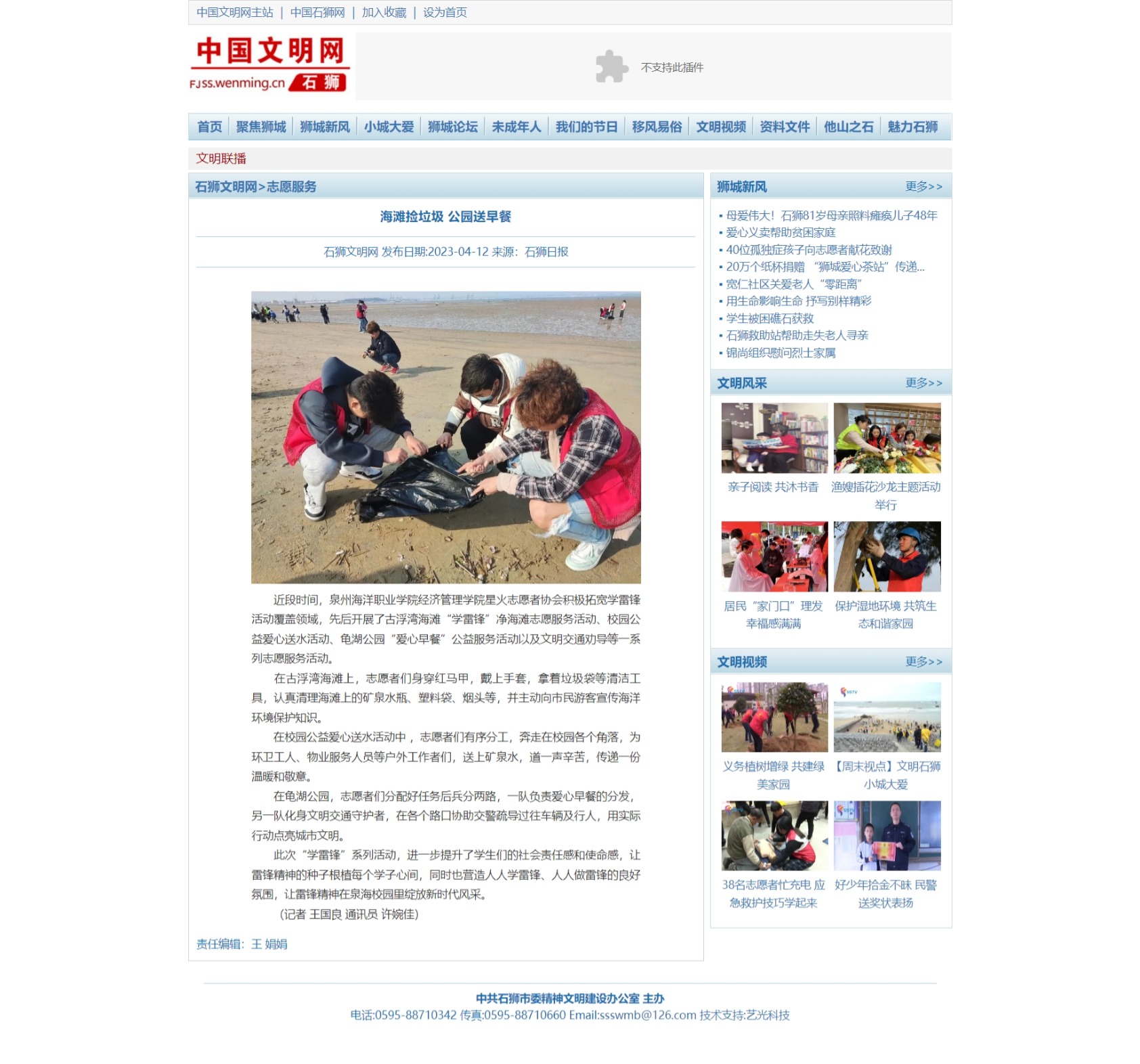 本报讯 近段时间,泉州海洋职业学院经济管理学院星火志愿者协会积极拓宽学雷锋活动覆盖领域,先后开展了古浮湾海滩“学雷锋”净海滩志愿服务活动、校园公益爱心送水活动、龟湖公园“爱心早餐”公益服务活动以及文明交...