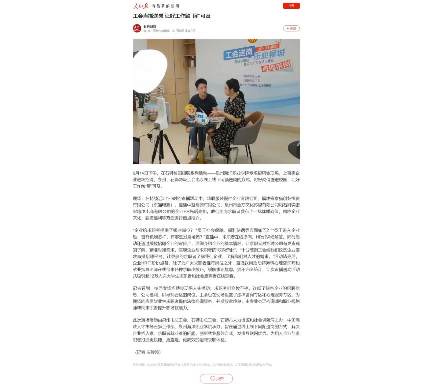 本报讯 (记者刘倩 通讯员辛丽萍)由中国石狮国际食品城、泉州海洋职业学院共同主办的“美好‘食’光在泉海”首届大学生直播大赛于6月1日正式启动,近270名学生报名参赛。本次大赛为期15天,从6月1日持续至6月15日。...