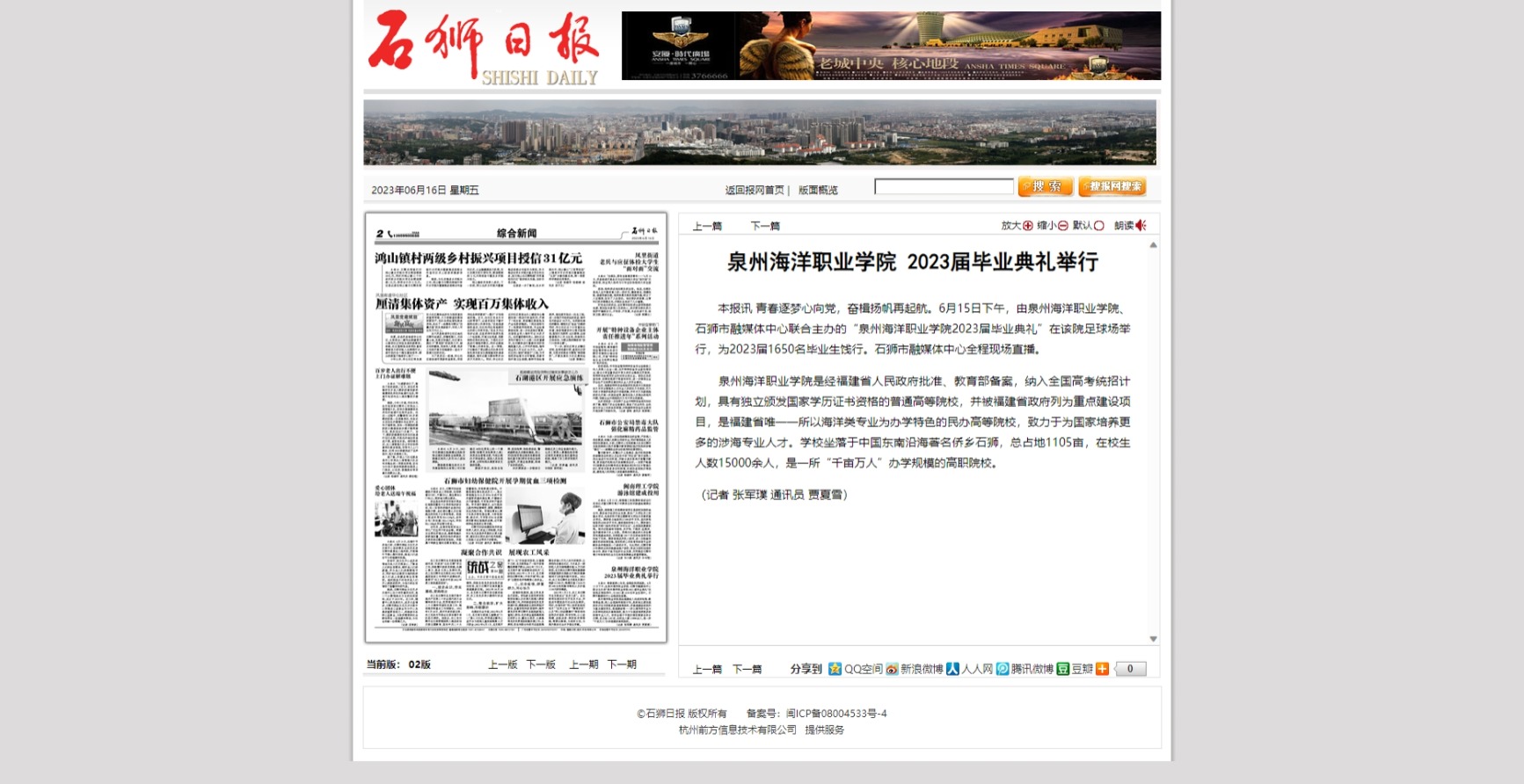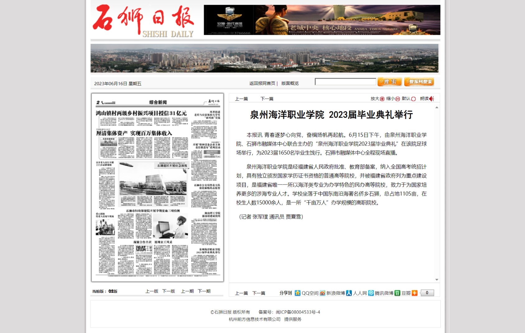 (记者张军璞 通讯员贾夏雪) 青春逐梦心向党,奋楫扬帆再起航。6月15日下午,由泉州海洋职业学院、石狮市融媒体中心联合主办的“泉州海洋职业学院2023届毕业典礼”在该院足球场举行,为2023届1650名毕业生饯行。石狮...