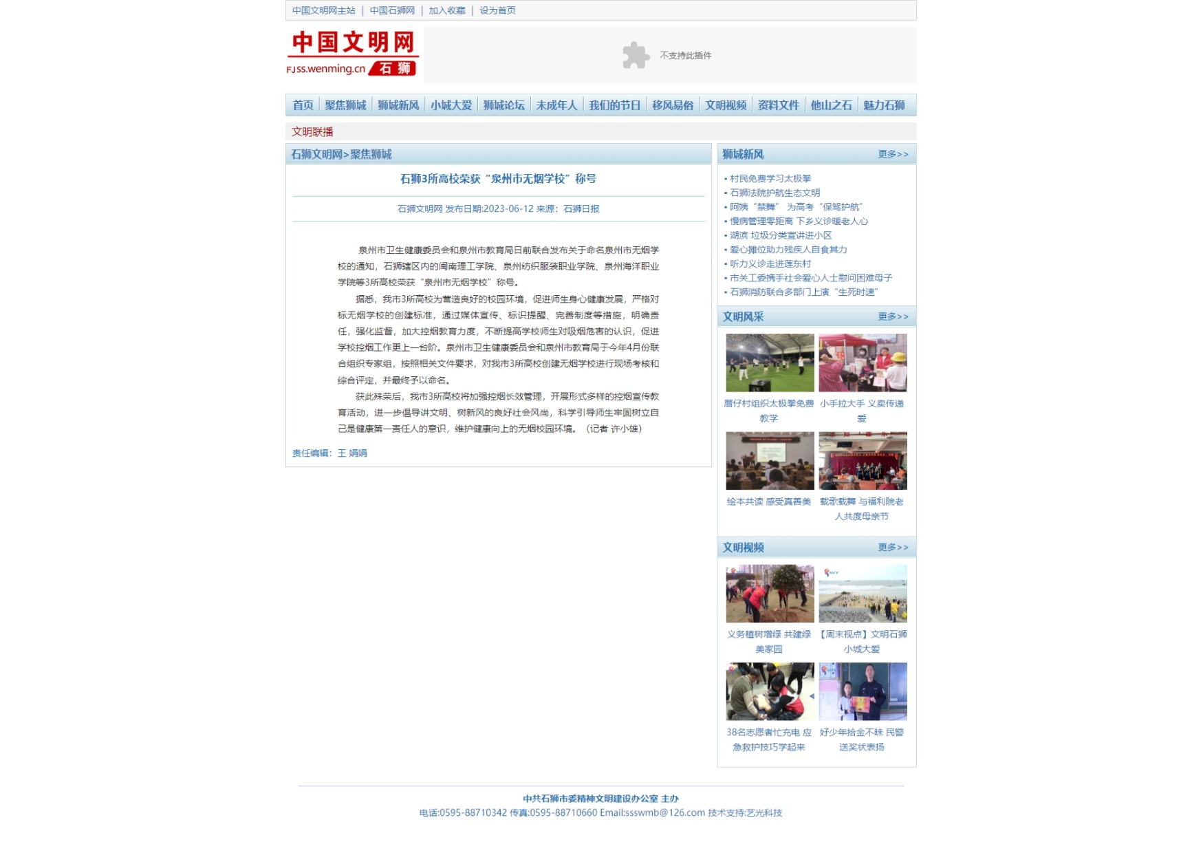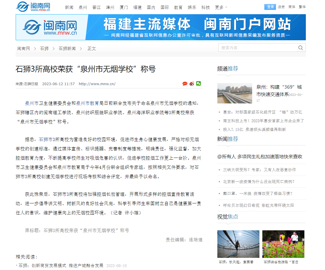 泉州市卫生健康委员会和泉州市教育局日前联合发布关于命名泉州市无烟学校的通知,石狮辖区内的闽南理工学院、泉州纺织服装职业学院、泉州海洋职业学院等3所高校荣获“泉州市无烟学校”称号。 据悉,我市3所高校为营...