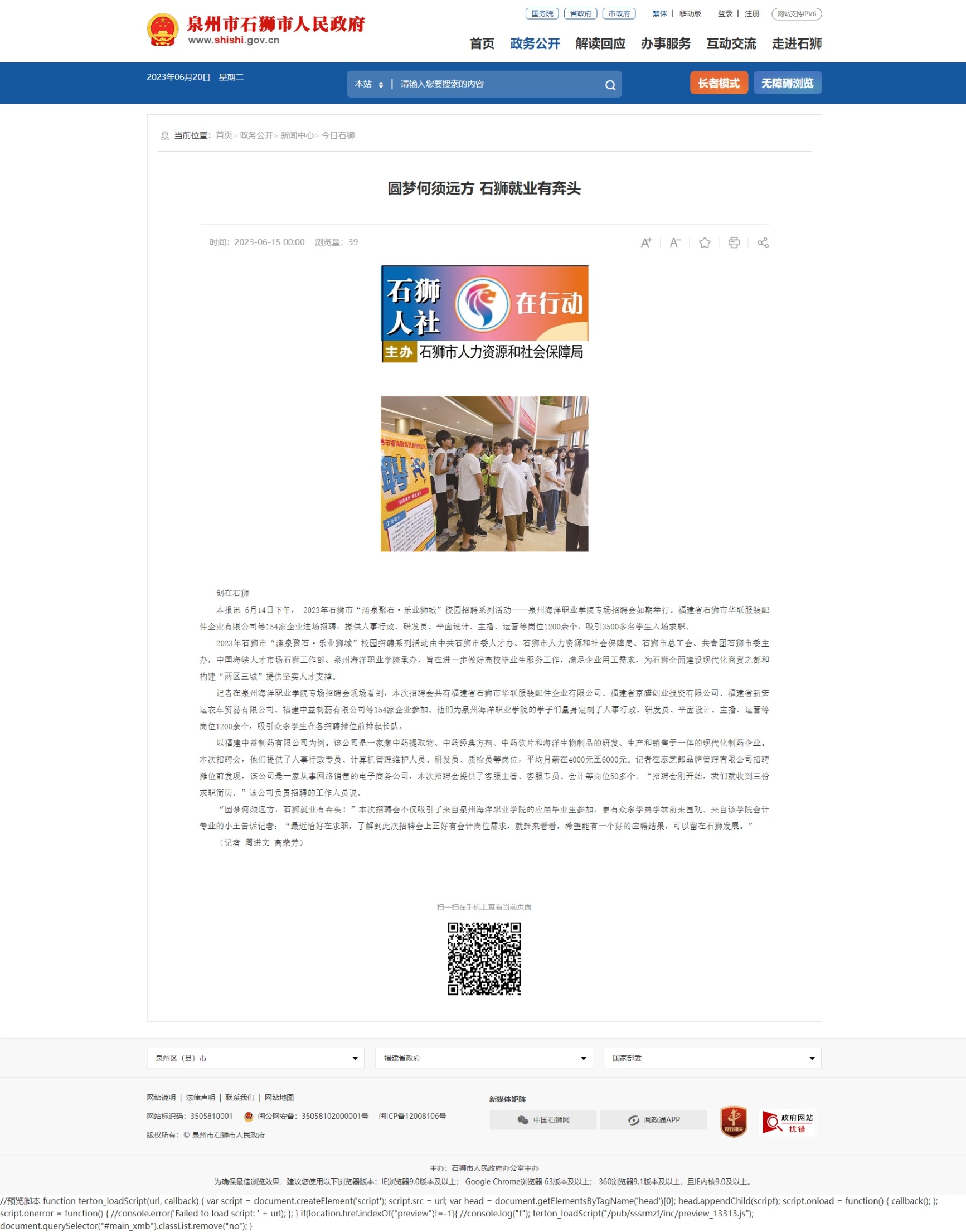 (记者 周进文 高荣芳)6月14日下午, 2023年石狮市“涌泉聚石·乐业狮城”校园招聘系列活动——泉州海洋职业学院专场招聘会如期举行。福建省石狮市华联服装配件企业有限公司等154家企业进场招聘,提供人事行政、研发...