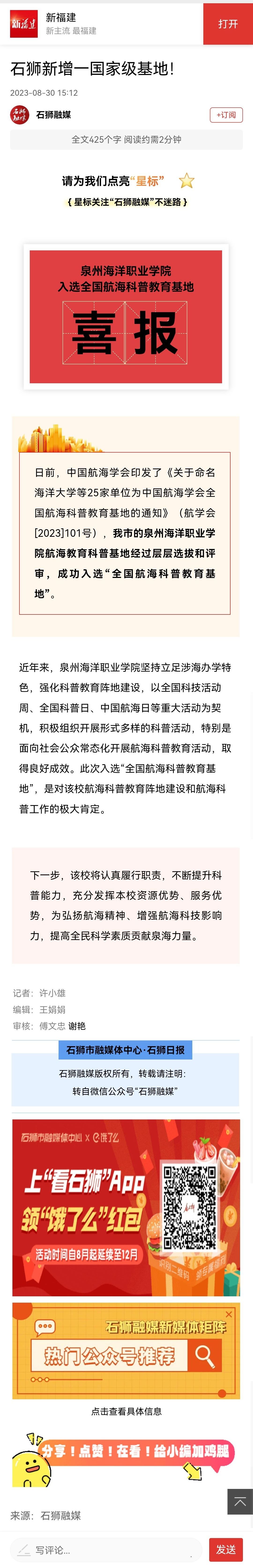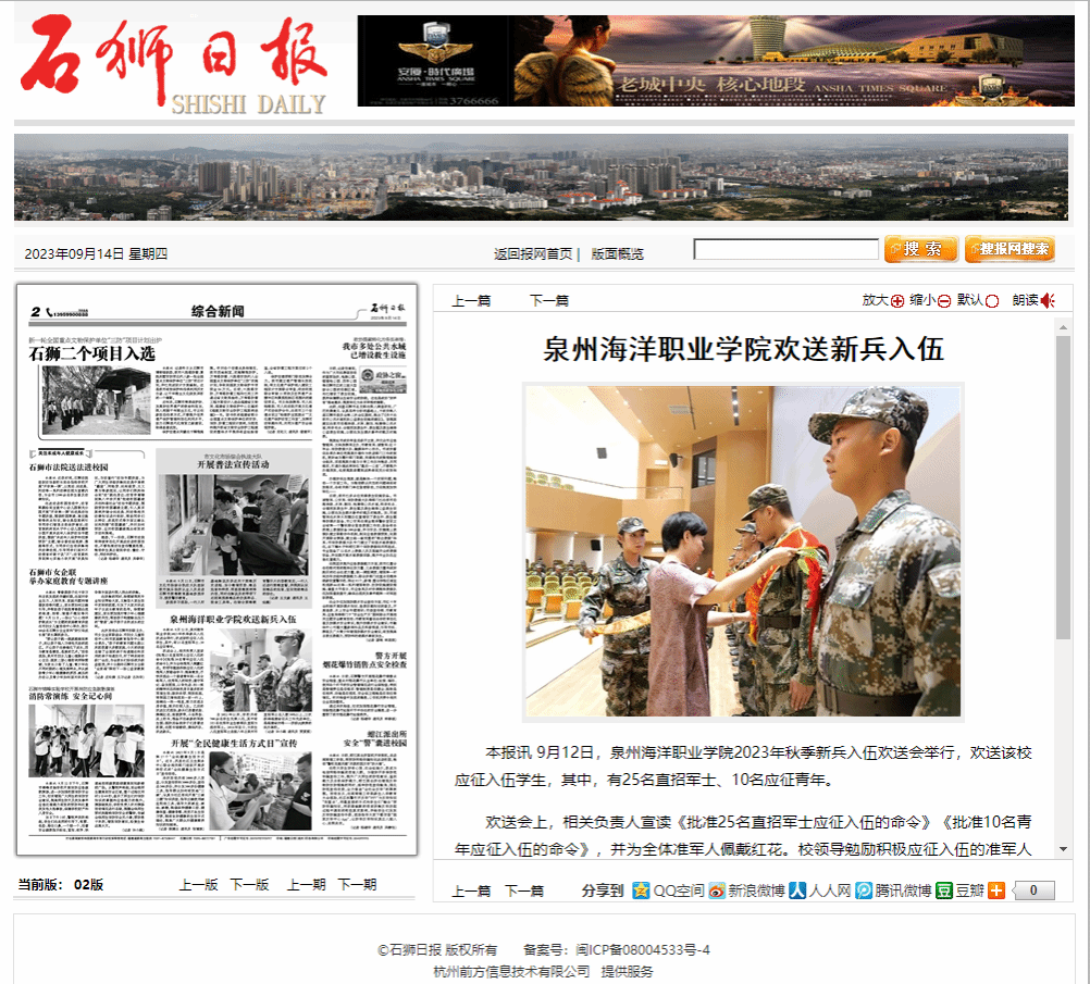 本报讯 9月12日,泉州海洋职业学院2023年秋季新兵入伍欢送会举行,欢送该校应征入伍学生,其中,有25名直招军士、10名应征青年。 欢送会上,相关负责人宣读《批准25名直招军士应征入伍的命令》《批准10名青年应征入伍...