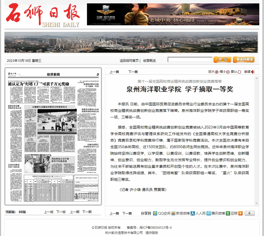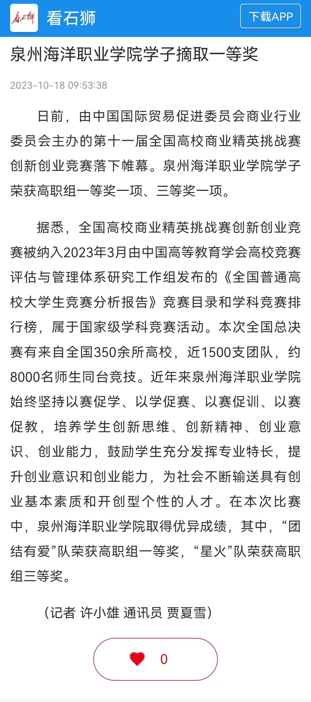 本报讯 日前,由中国国际贸易促进委员会商业行业委员会主办的第十一届全国高校商业精英挑战赛创新创业竞赛落下帷幕。泉州海洋职业学院学子荣获高职组一等奖一项、三等奖一项。 据悉,全国高校商业精英挑战赛创新创业...