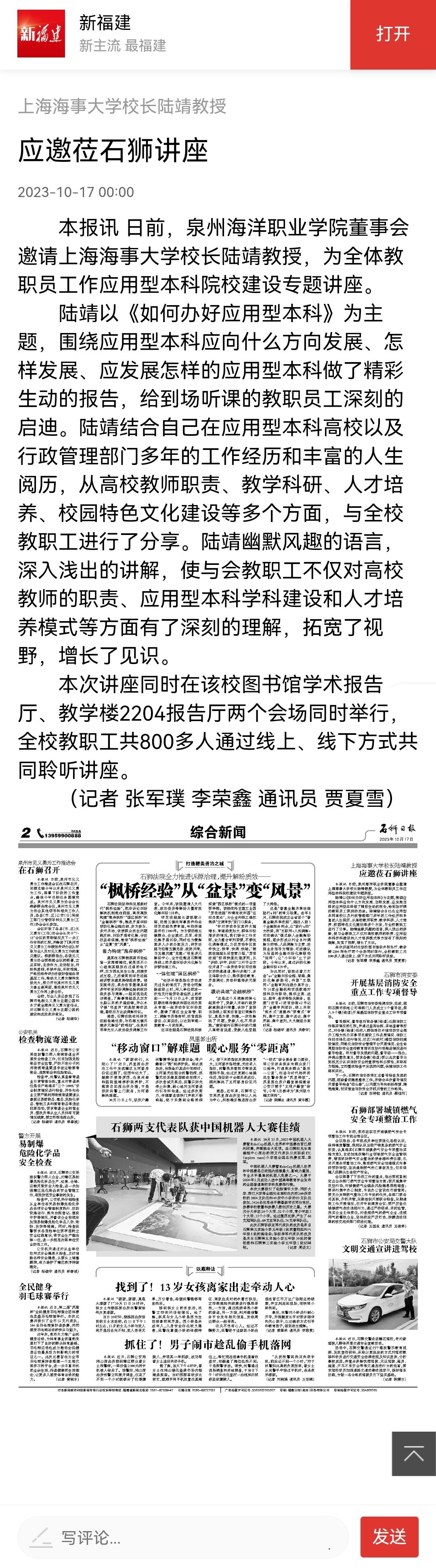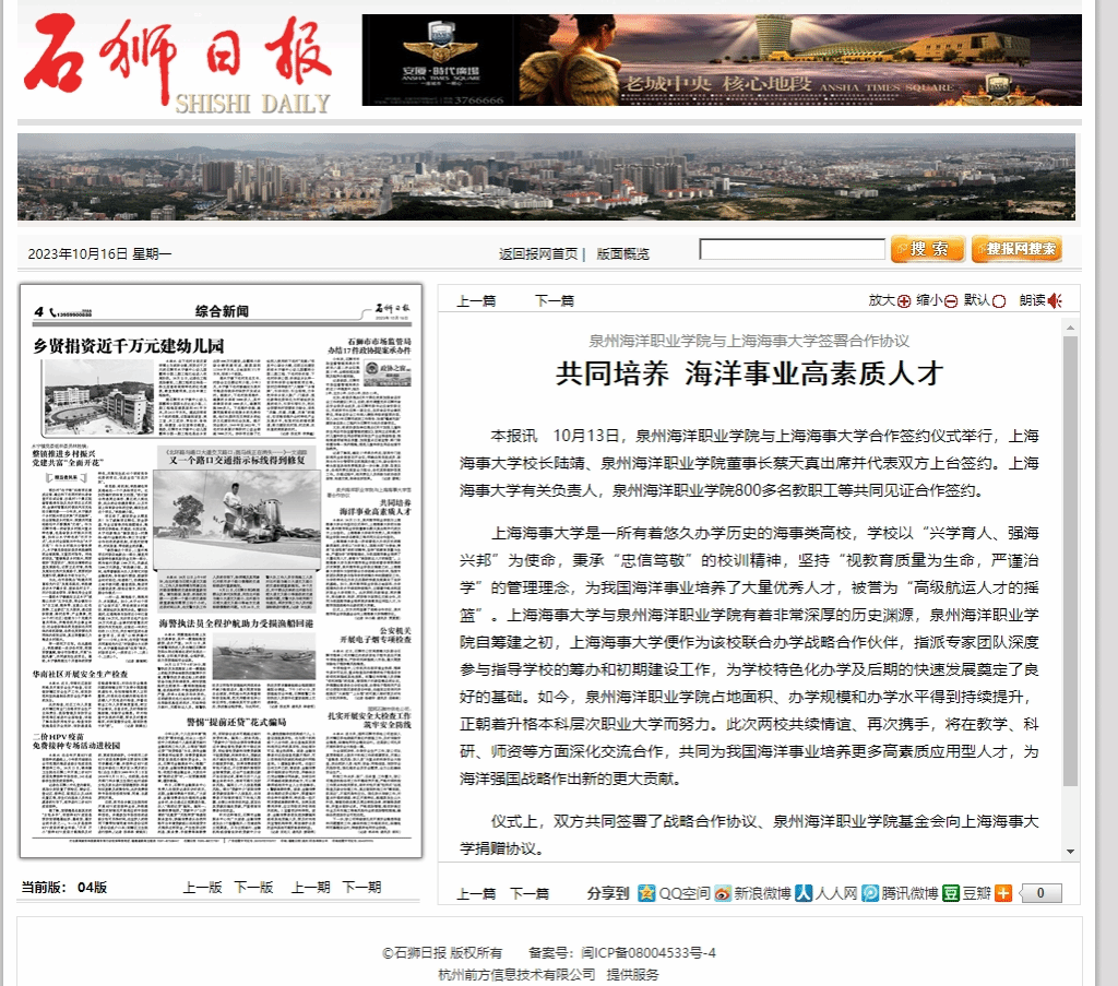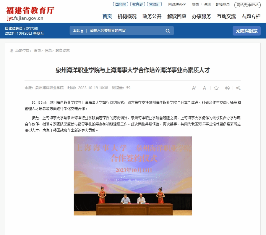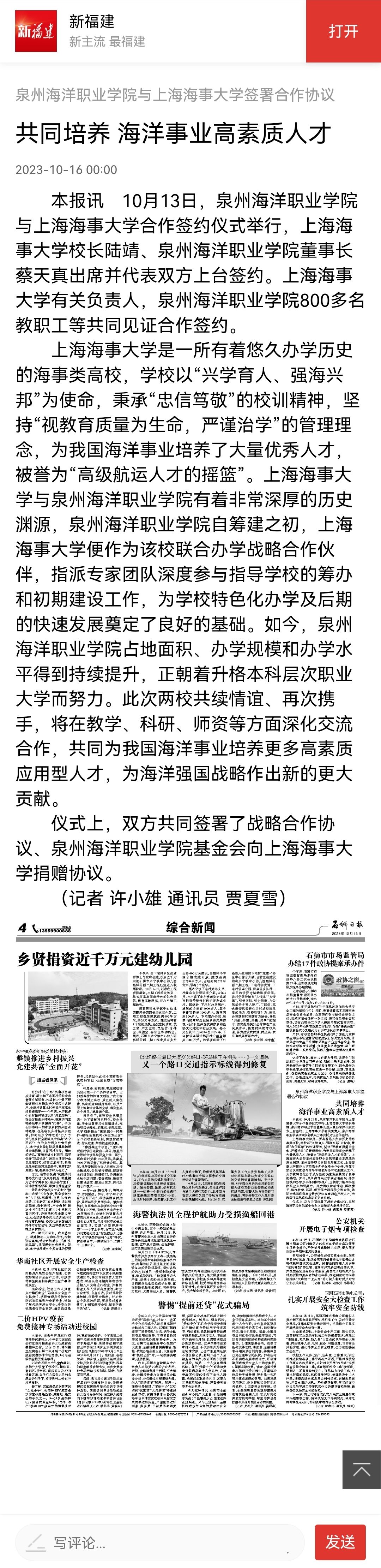 本报讯 10月13日,泉州海洋职业学院与上海海事大学合作签约仪式举行,上海海事大学校长陆靖、泉州海洋职业学院董事长蔡天真出席并代表双方上台签约。上海海事大学有关负责人,泉州海洋职业学院800多名教职工等共同见...