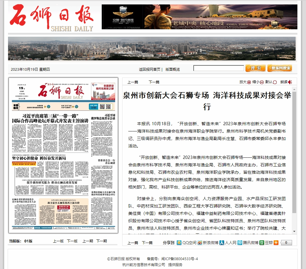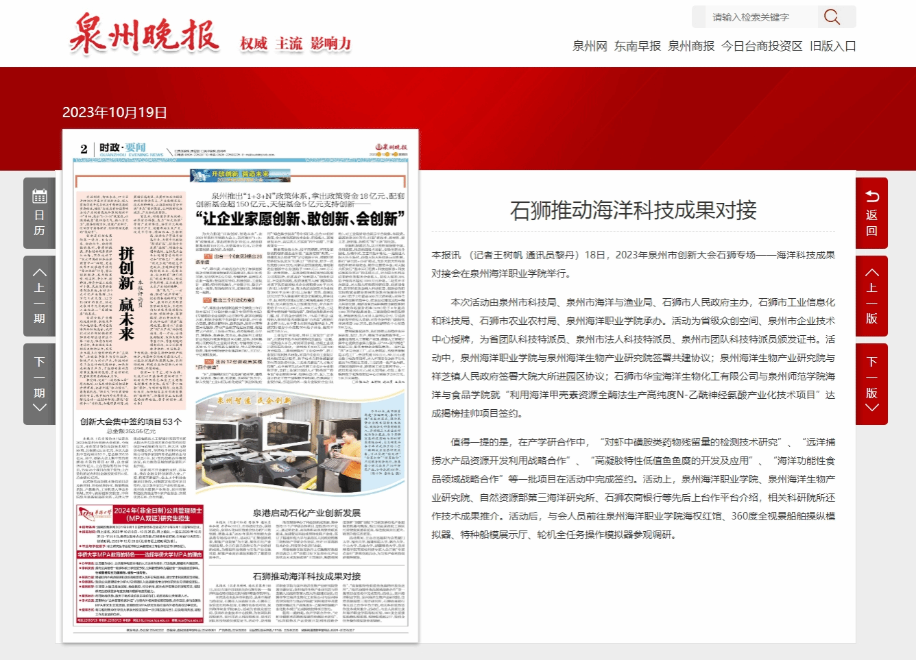 本报讯 (记者王树帆 通讯员黎丹)18日,2023年泉州市创新大会石狮专场——海洋科技成果对接会在泉州海洋职业学院举行。 本次活动由泉州市科技局、泉州市海洋与渔业局、石狮市人民政府主办,石狮市工业信息化和科技局...
