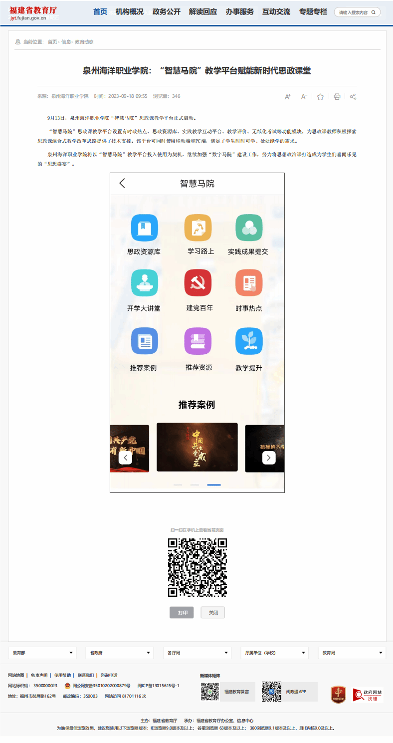 9月13日,泉州海洋职业学院“智慧马院”思政课教学平台正式启动。 “智慧马院”思政课教学平台设置有时政热点、思政资源库、实践教学互动平台、教学评价、无纸化考试等功能模块,为思政课教师积极探索思政课混合式教...