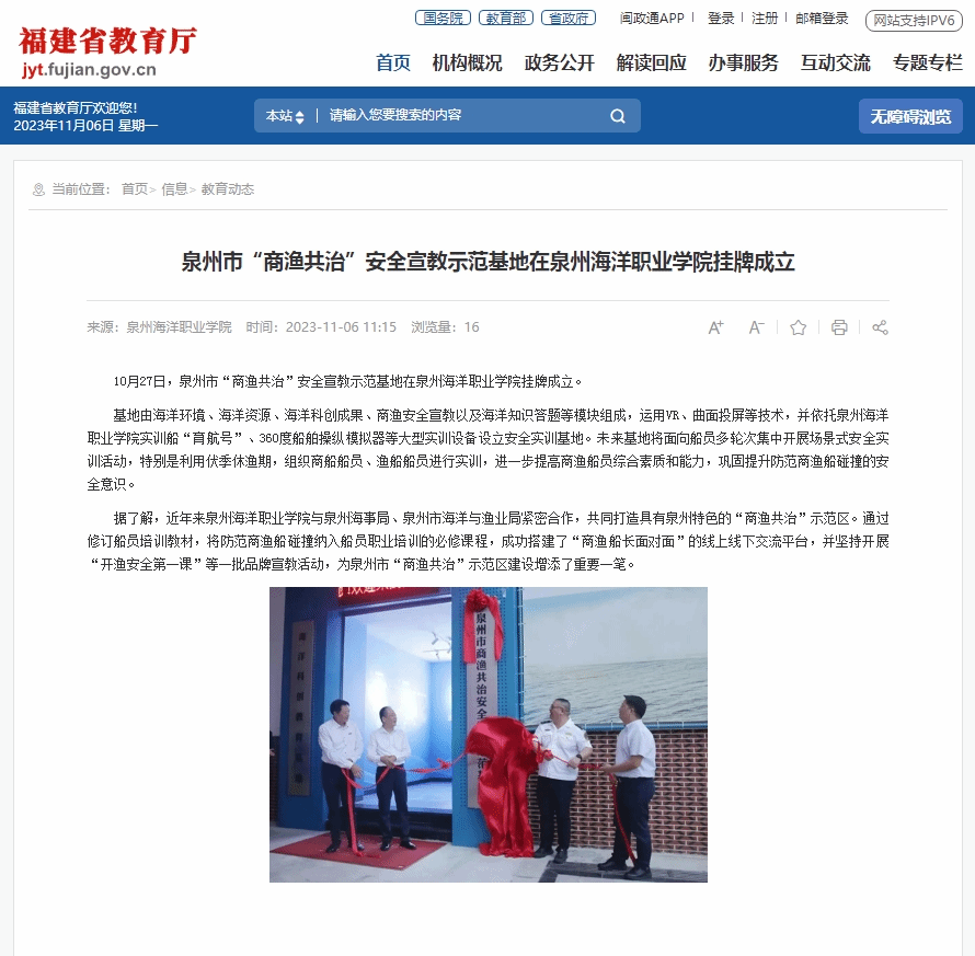 【福建省教育厅】泉州市“商渔共治”安全宣教示范基地在泉州海洋职业学院挂牌成立