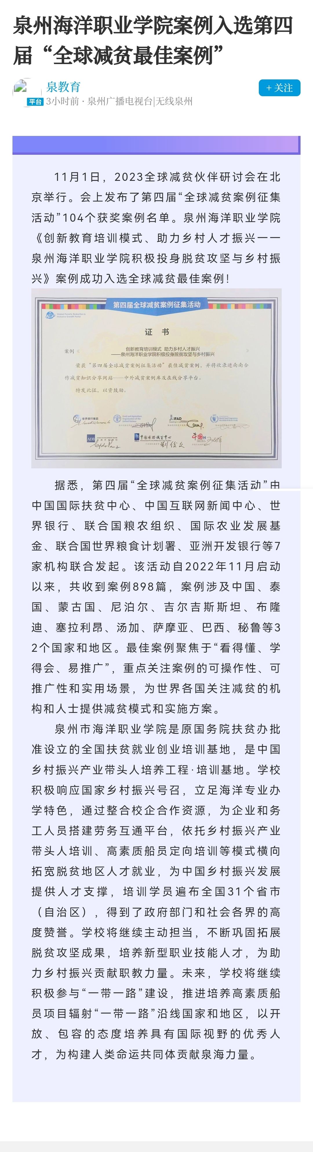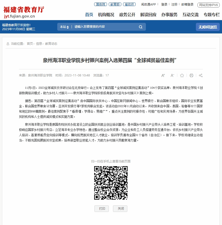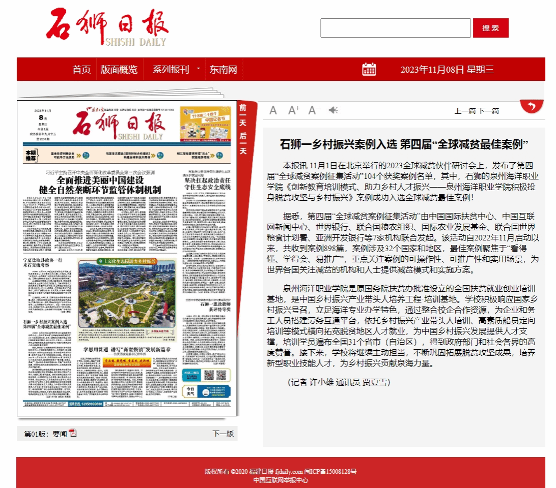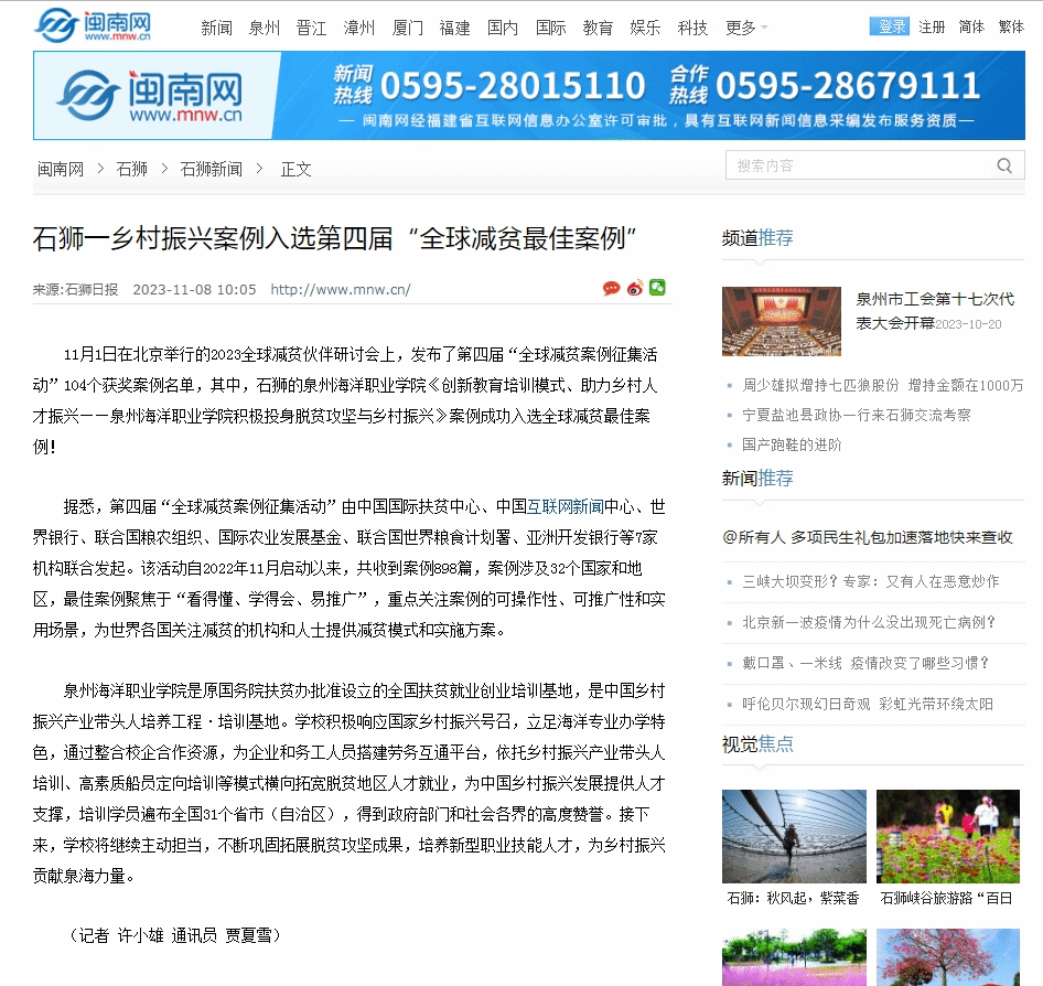本报讯 11月1日在北京举行的2023全球减贫伙伴研讨会上,发布了第四届“全球减贫案例征集活动”104个获奖案例名单,其中,石狮的泉州海洋职业学院《创新教育培训模式、助力乡村人才振兴——泉州海洋职业学院积极投身脱...