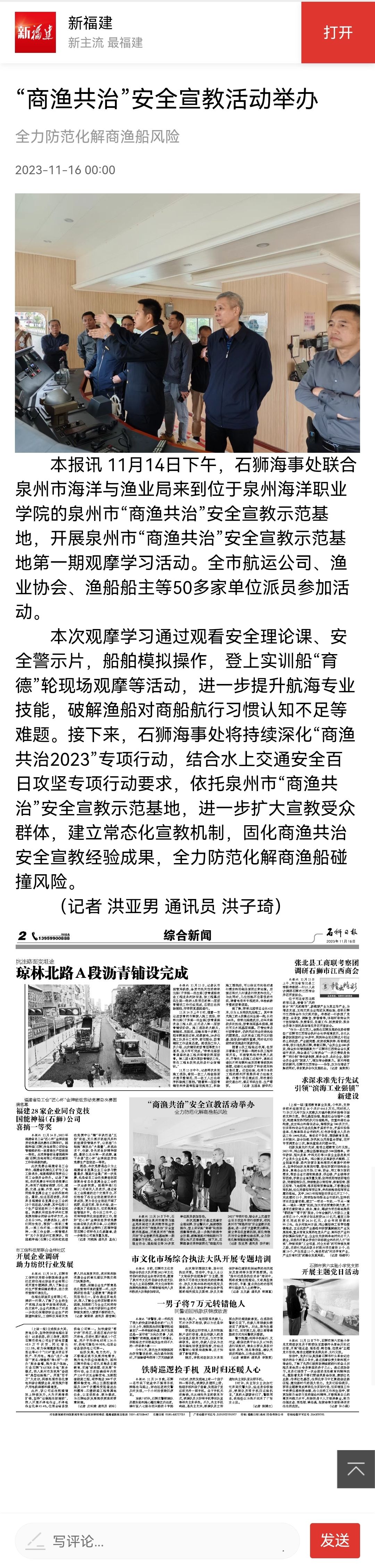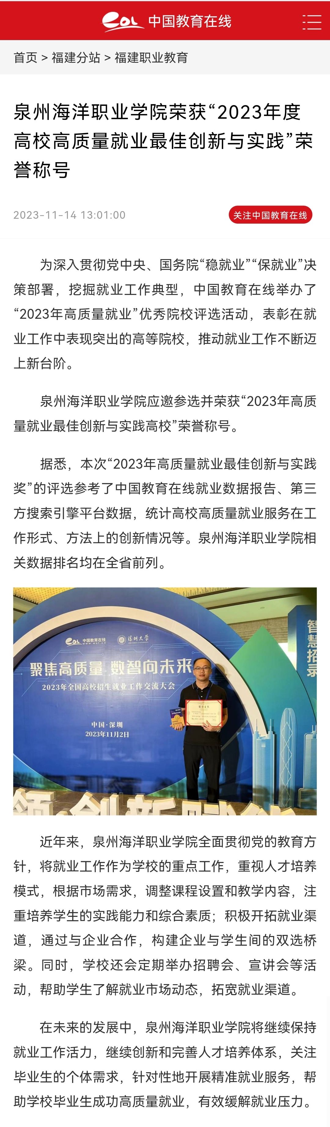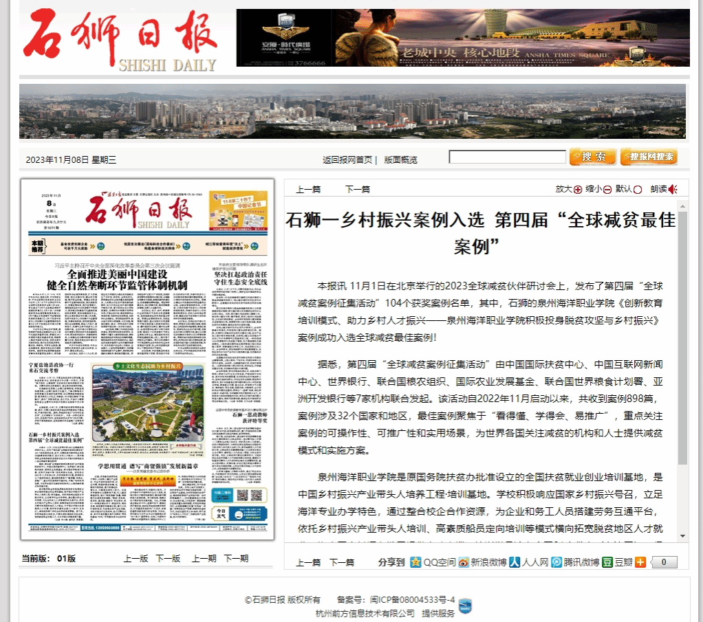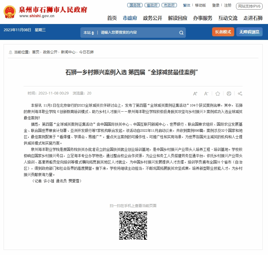 本报讯 11月1日在北京举行的2023全球减贫伙伴研讨会上,发布了第四届“全球减贫案例征集活动”104个获奖案例名单,其中,石狮的泉州海洋职业学院《创新教育培训模式、助力乡村人才振兴——泉州海洋职业学院积极投身脱...