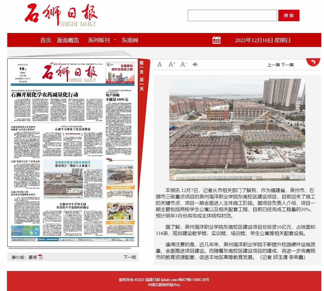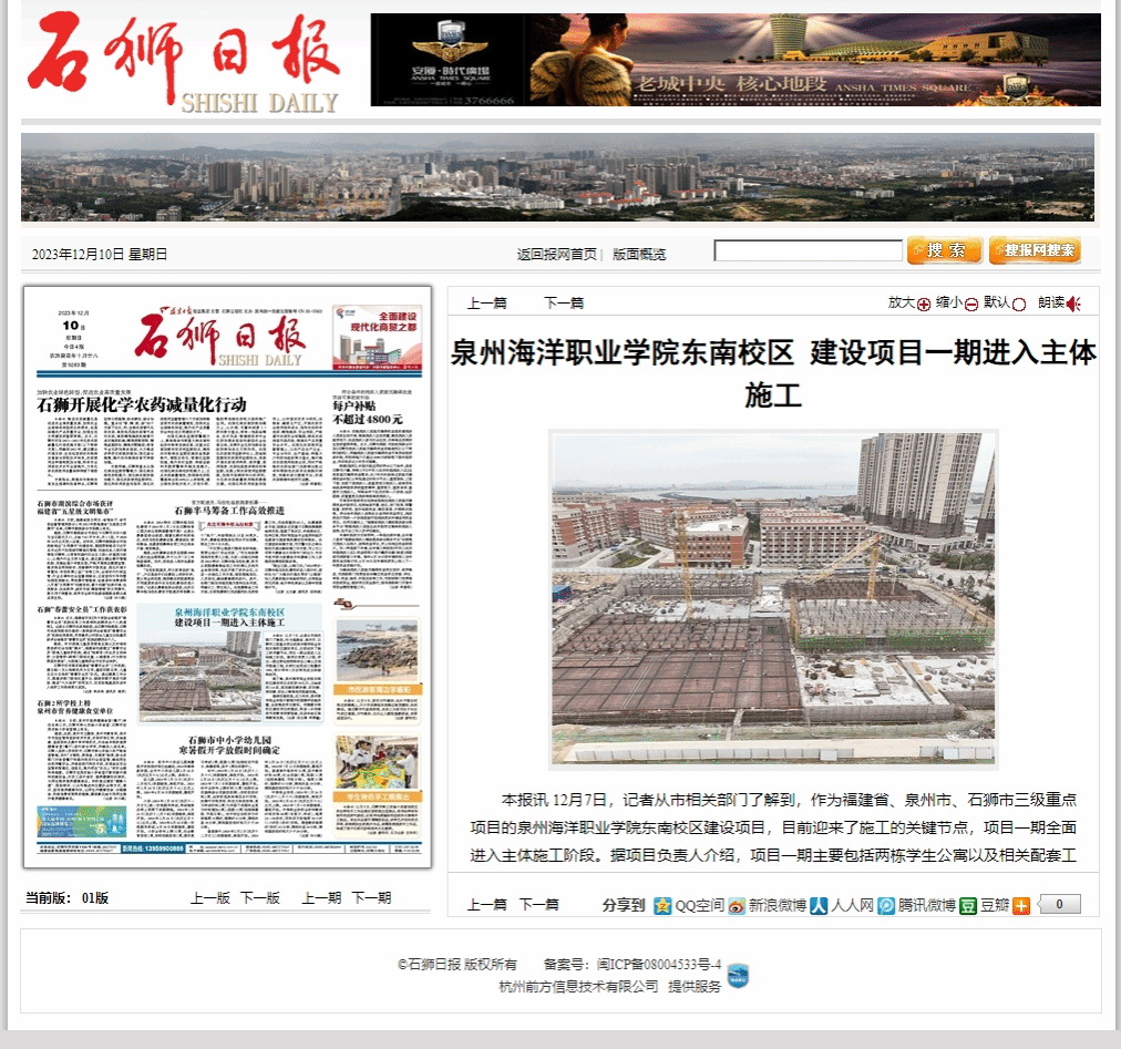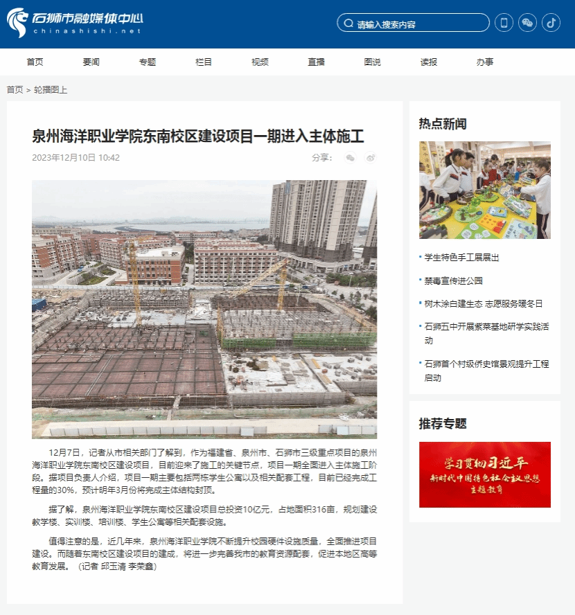 本报讯 12月7日,记者从市相关部门了解到,作为福建省、泉州市、石狮市三级重点项目的泉州海洋职业学院东南校区建设项目,目前迎来了施工的关键节点,项目一期全面进入主体施工阶段。据项目负责人介绍,项目一期主要...