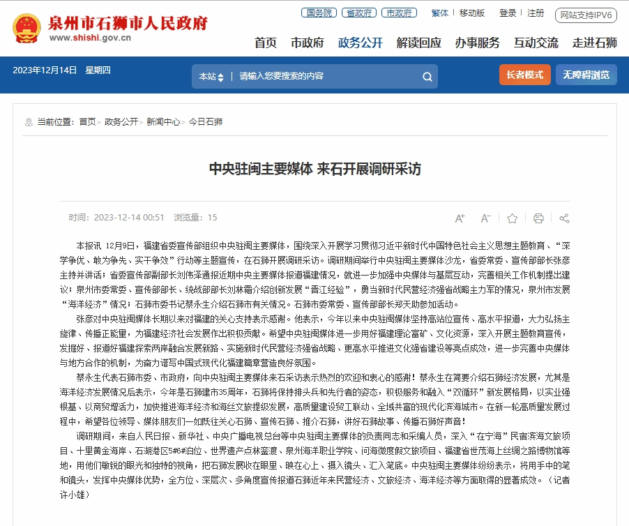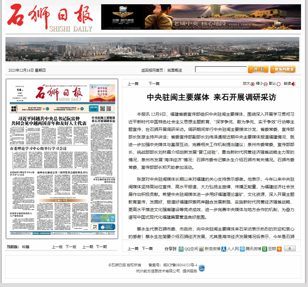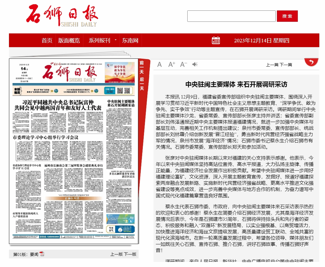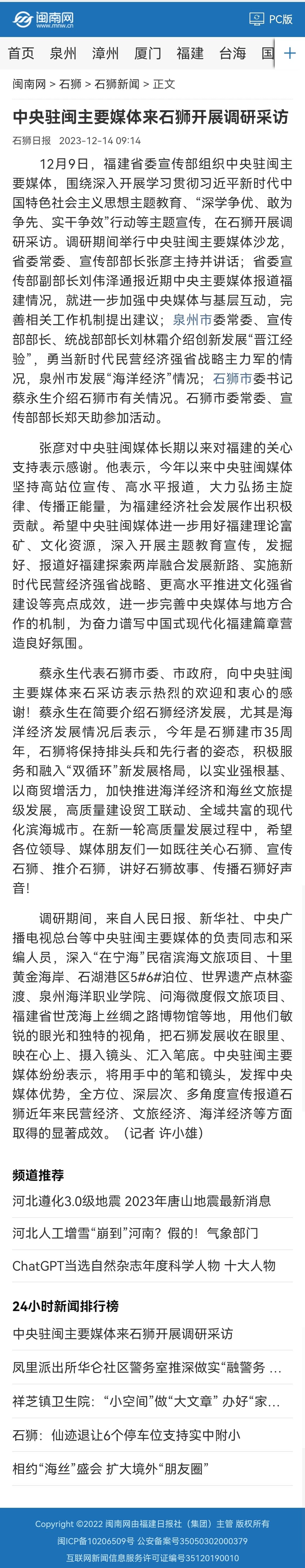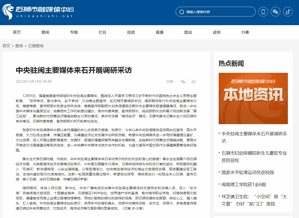 本报讯 12月9日,福建省委宣传部组织中央驻闽主要媒体,围绕深入开展学习贯彻习近平新时代中国特色社会主义思想主题教育、“深学争优、敢为争先、实干争效”行动等主题宣传,在石狮开展调研采访。调研期间举行中央驻...
