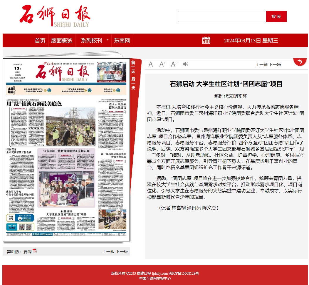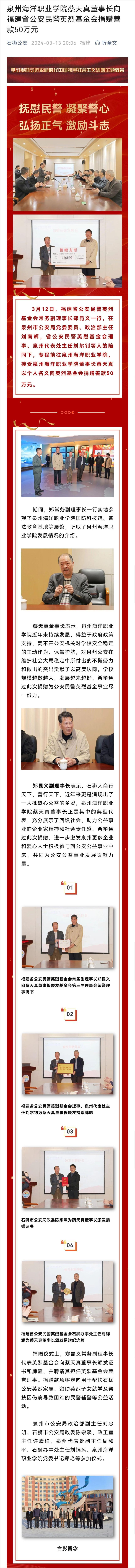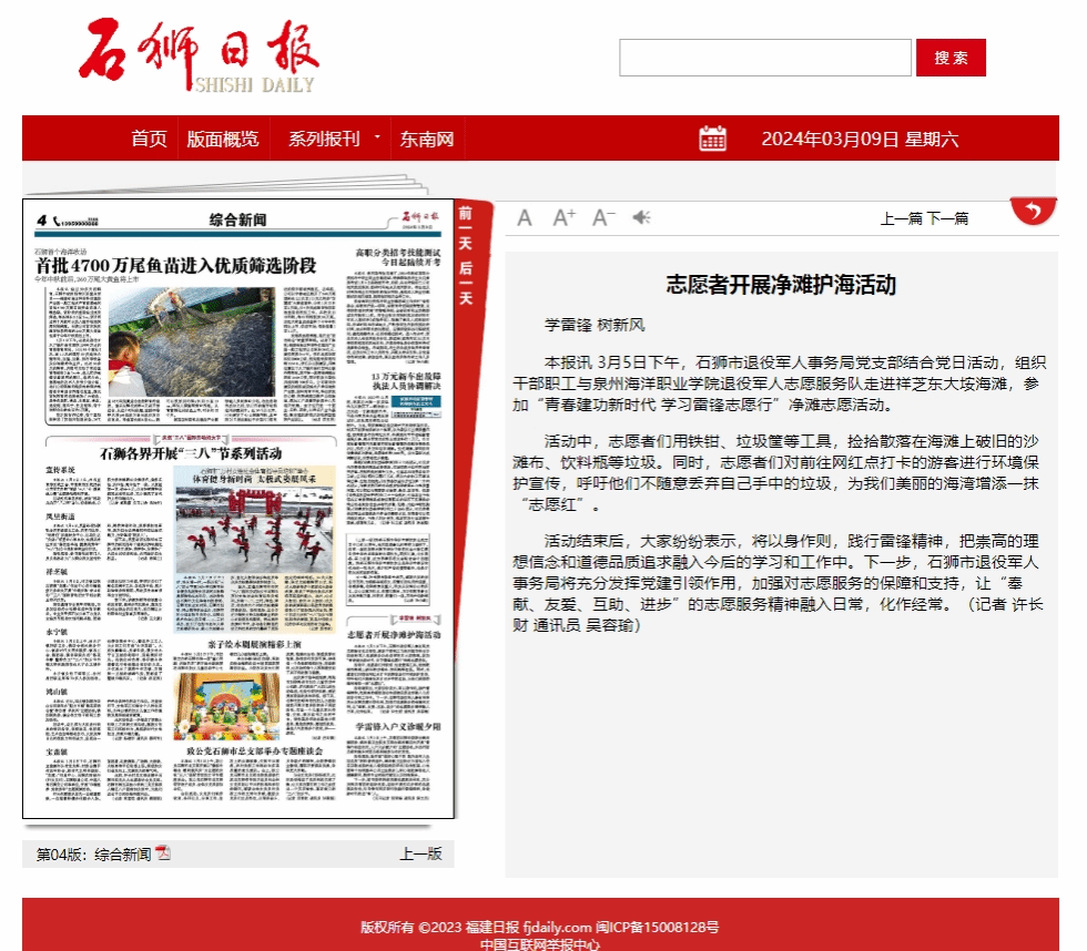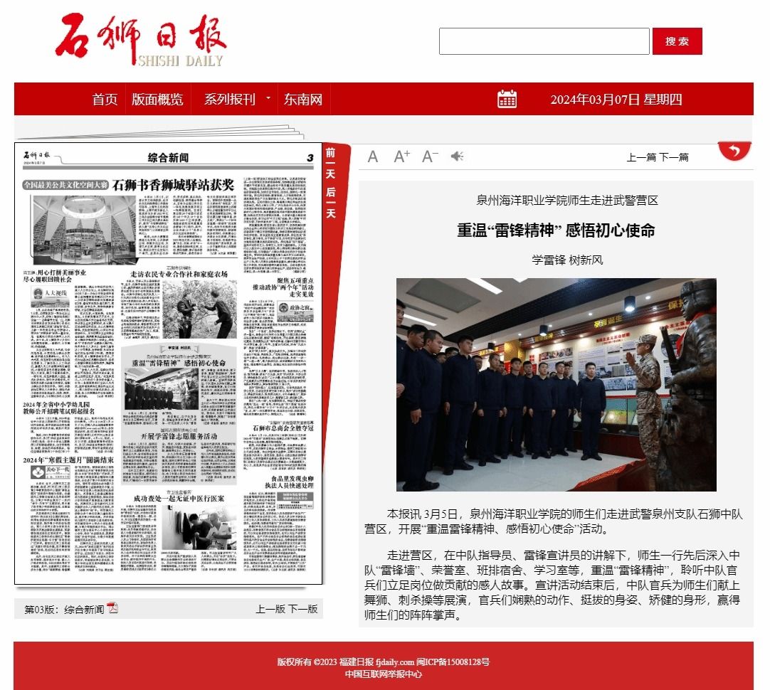 本报讯 3月5日,泉州海洋职业学院的师生们走进武警泉州支队石狮中队营区,开展“重温雷锋精神、感悟初心使命”活动。 走进营区,在中队指导员、雷锋宣讲员的讲解下,师生一行先后深入中队“雷锋墙”、荣誉室、班排宿...