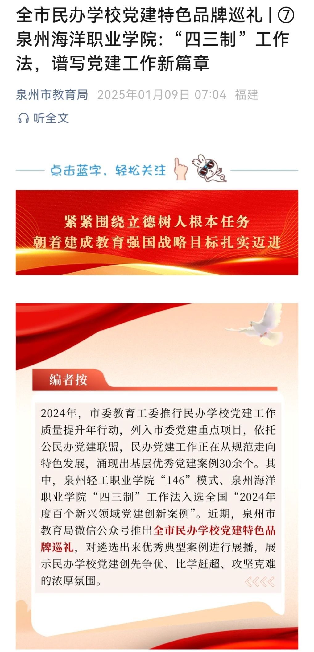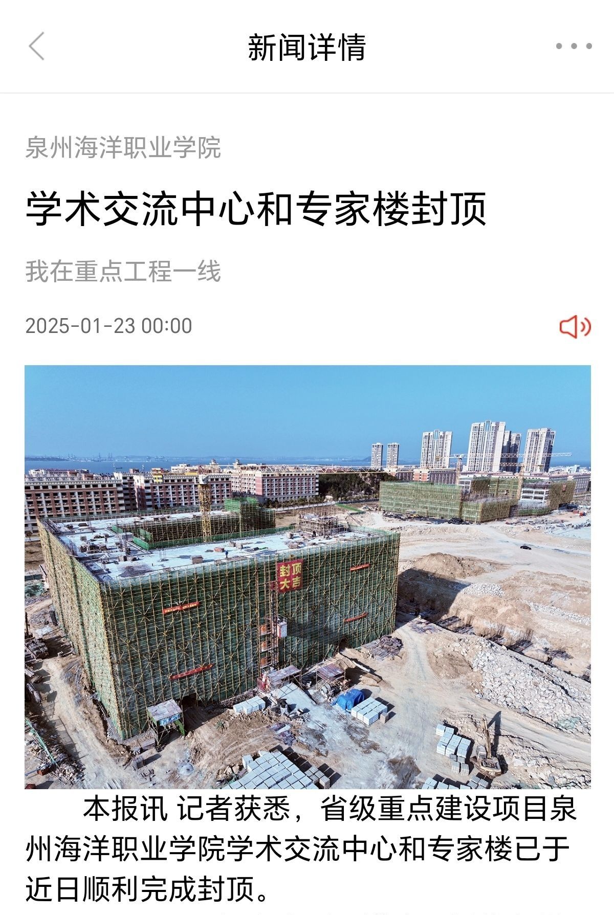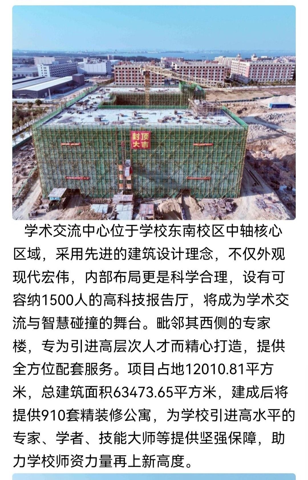 (新闻中心讯 党委宣传部报道)新年伊始,万象更新,伴随着最后一方混凝土的成功浇筑,泉州海洋职业学院学术交流中心和专家楼主体结构荣耀封顶,校园建设迈入崭新阶段,校园环境持续全面升级与美化,为学生们打造了一个更加舒适、现代、高效的学习与生活空间,为学校2025年的崭新篇章开启序幕,奋力推进泉海梦想的实现。学术交流中心位于学校东南校区中轴核心区域,采用先进的建筑设计理念,不仅外观现代宏伟,内部布局更是科学合理,...