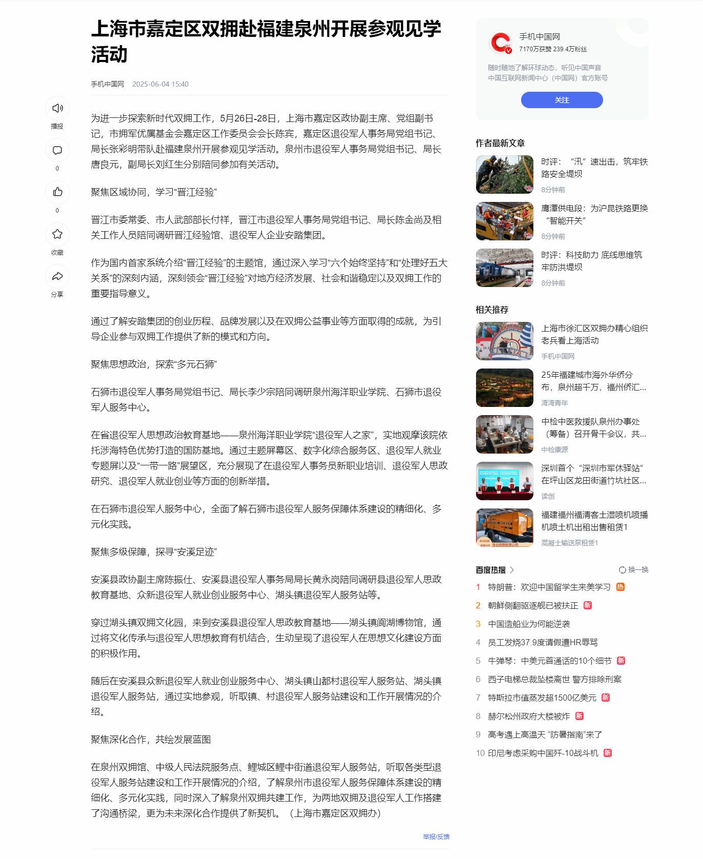 【中国互联网新闻中心(中国网)】上海市嘉定区双拥赴福建泉州开展参观见学活动