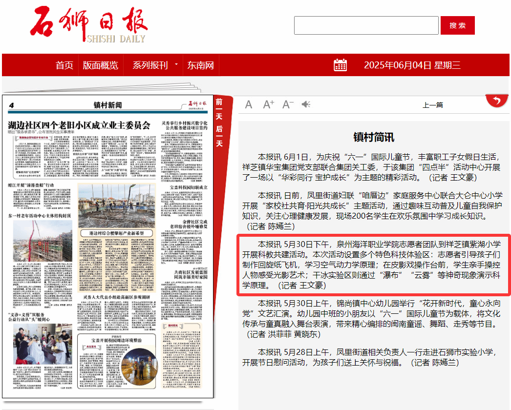 【石狮日报】泉州海洋职业学院志愿者团队走进祥芝镇紫湖小学开展科教共建活动