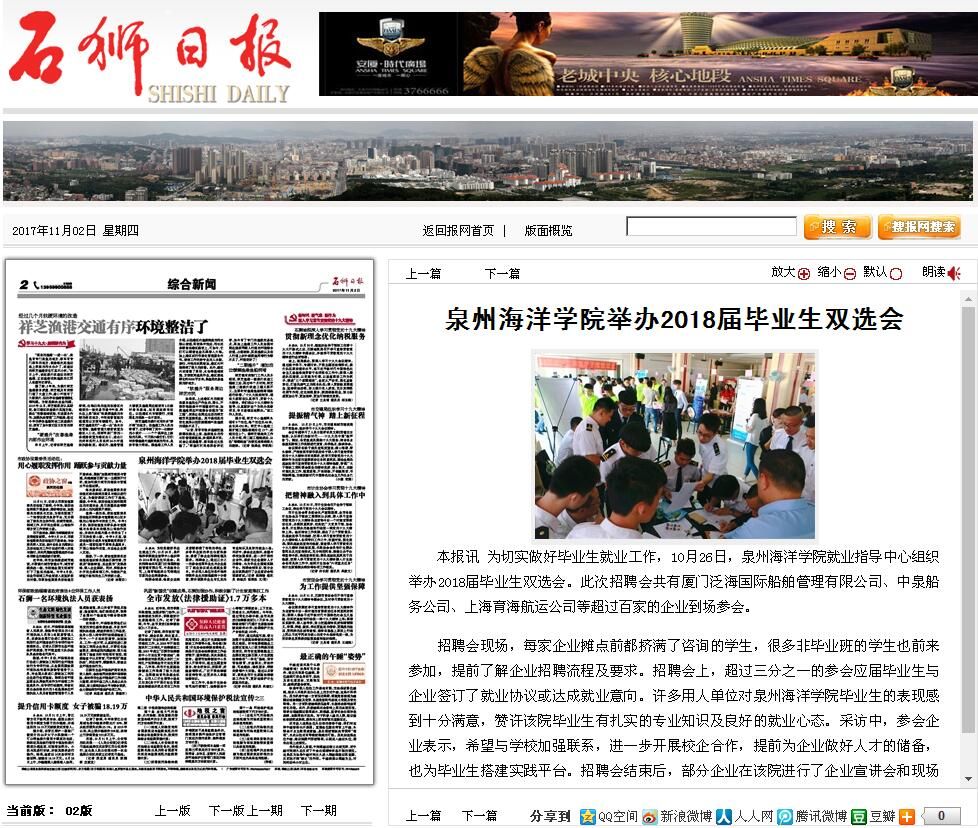 石狮日报讯 为切实做好毕业生就业工作,10月26日,泉州海洋学院就业指导中心组织举办2018届毕业生双选会。此次招聘会共有厦门泛海国际船舶管理有限公司、中泉船务公司、上海育海航运公司等超过百家的企业到场参会。 ...