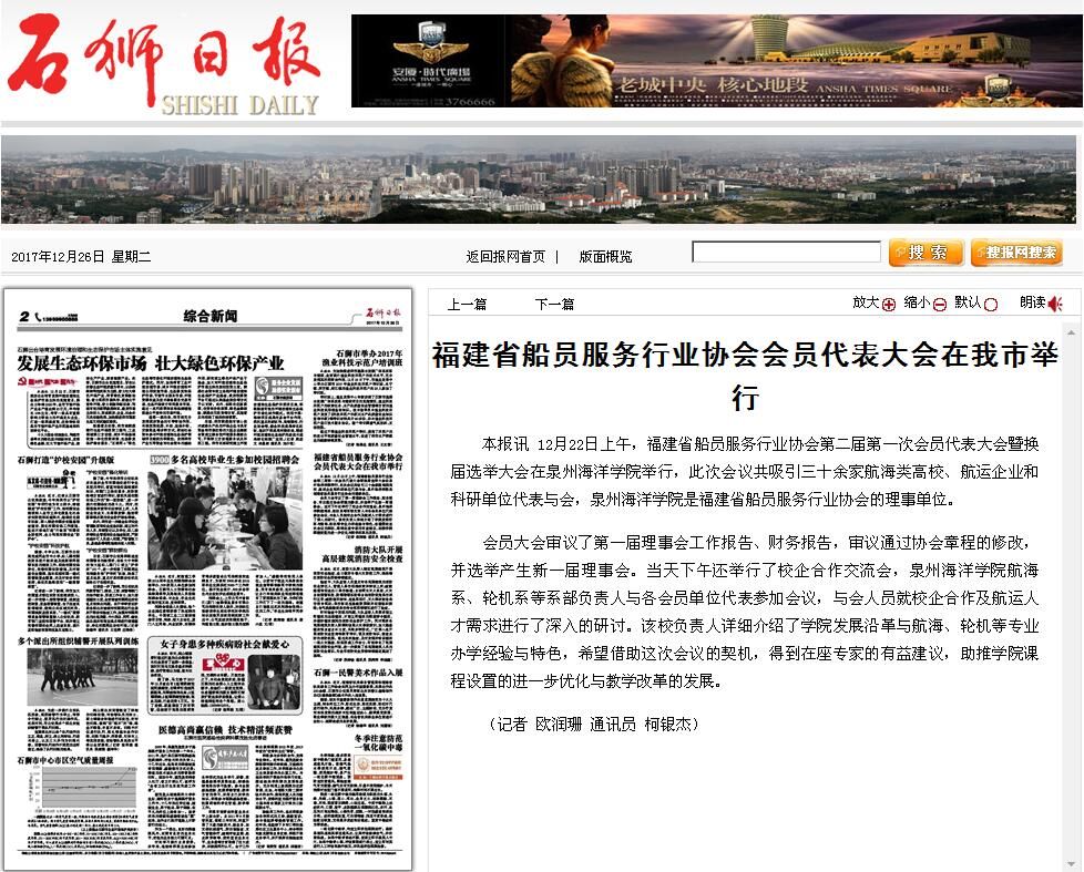 石狮日报讯 12月22日上午,福建省船员服务行业协会第二届第一次会员代表大会暨换届选举大会在泉州海洋学院举行,此次会议共吸引三十余家航海类高校、航运企业和科研单位代表与会,泉州海洋学院是福建省船员服务行业协...