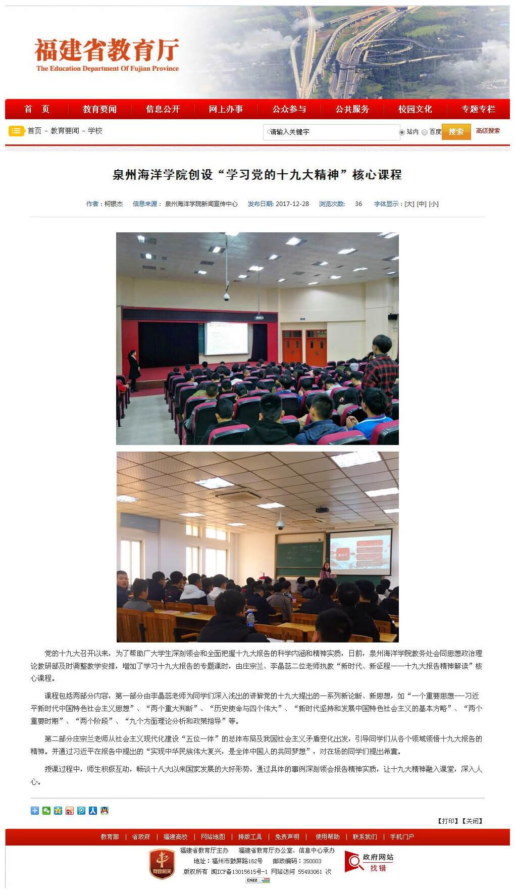 党的十九大召开以来,为了帮助广大学生深刻领会和全面把握十九大报告的科学内涵和精神实质,日前,泉州海洋学院教务处会同思想政治理论教研部及时调整教学安排,增加了学习十九大报告的专题课时,由庄宗兰、李晶蕊二...