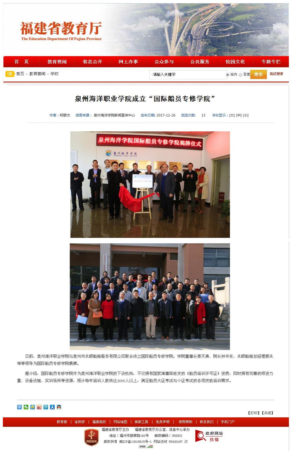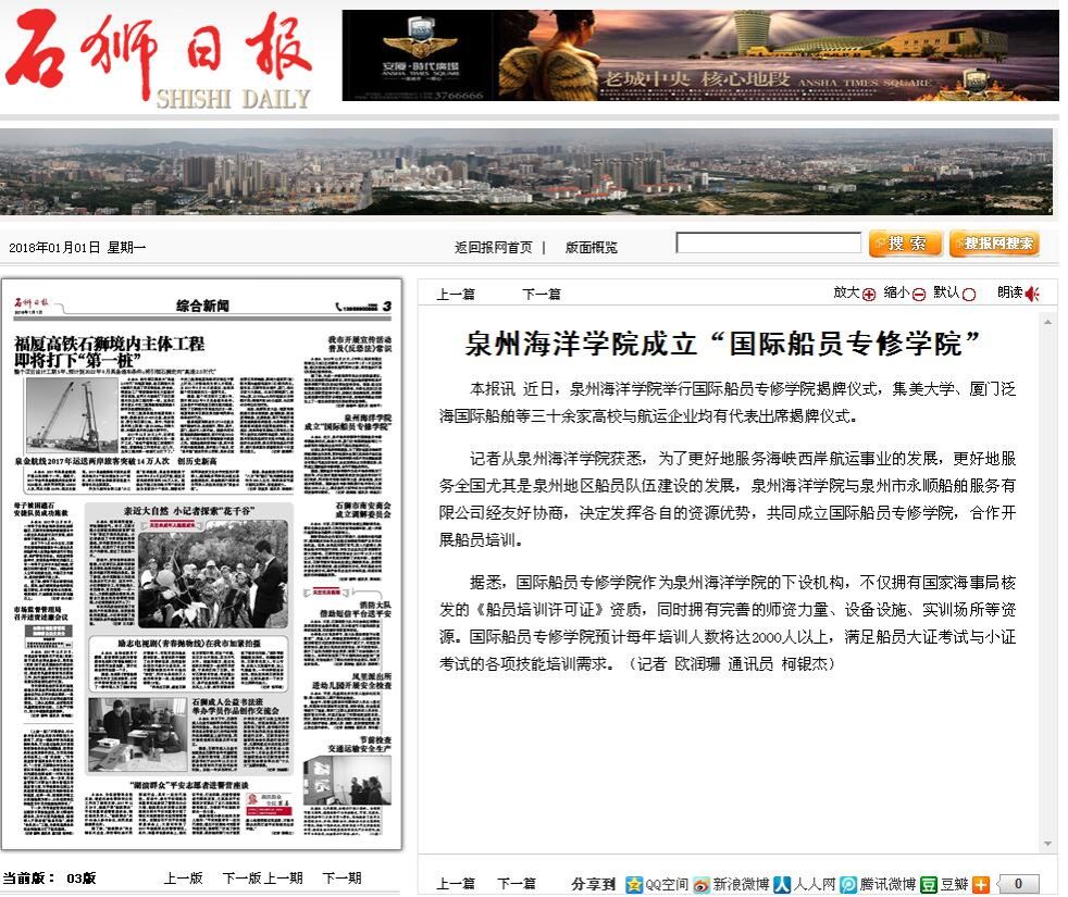 石狮日报讯 近日,泉州海洋学院举行国际船员专修学院揭牌仪式,集美大学、厦门泛海国际船舶等三十余家高校与航运企业均有代表出席揭牌仪式。 记者从泉州海洋学院获悉,为了更好地服务海峡西岸航运事业的发展,更好地...