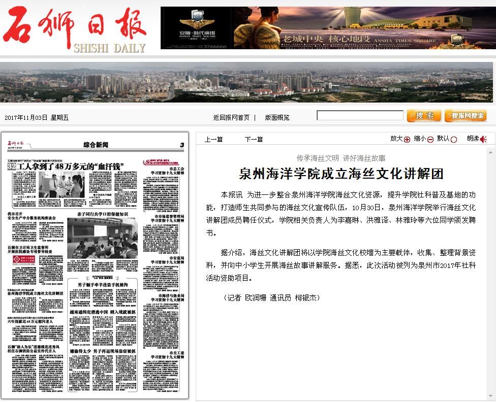 石狮日报讯 为进一步整合泉州海洋学院海丝文化资源,提升学院社科普及基地的功能,打造师生共同参与的海丝文化宣传队伍,10月30日,泉州海洋学院举行海丝文化讲解团成员聘任仪式,学院相关负责人为李嘉琳、洪雅译、林...