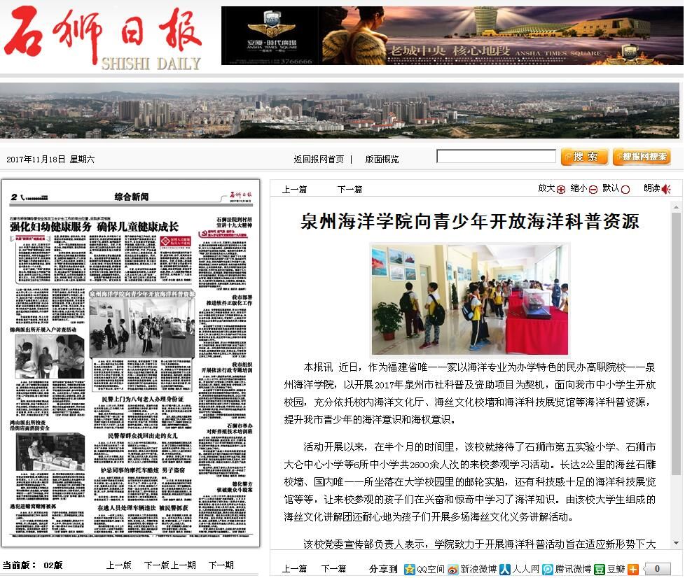 石狮日报讯 近日,作为福建省唯一一家以海洋专业为办学特色的民办高职院校——泉州海洋学院,以开展2017年泉州市社科普及资助项目为契机,面向我市中小学生开放校园,充分依托校内海洋文化厅、海丝文化校墙和海洋科技...