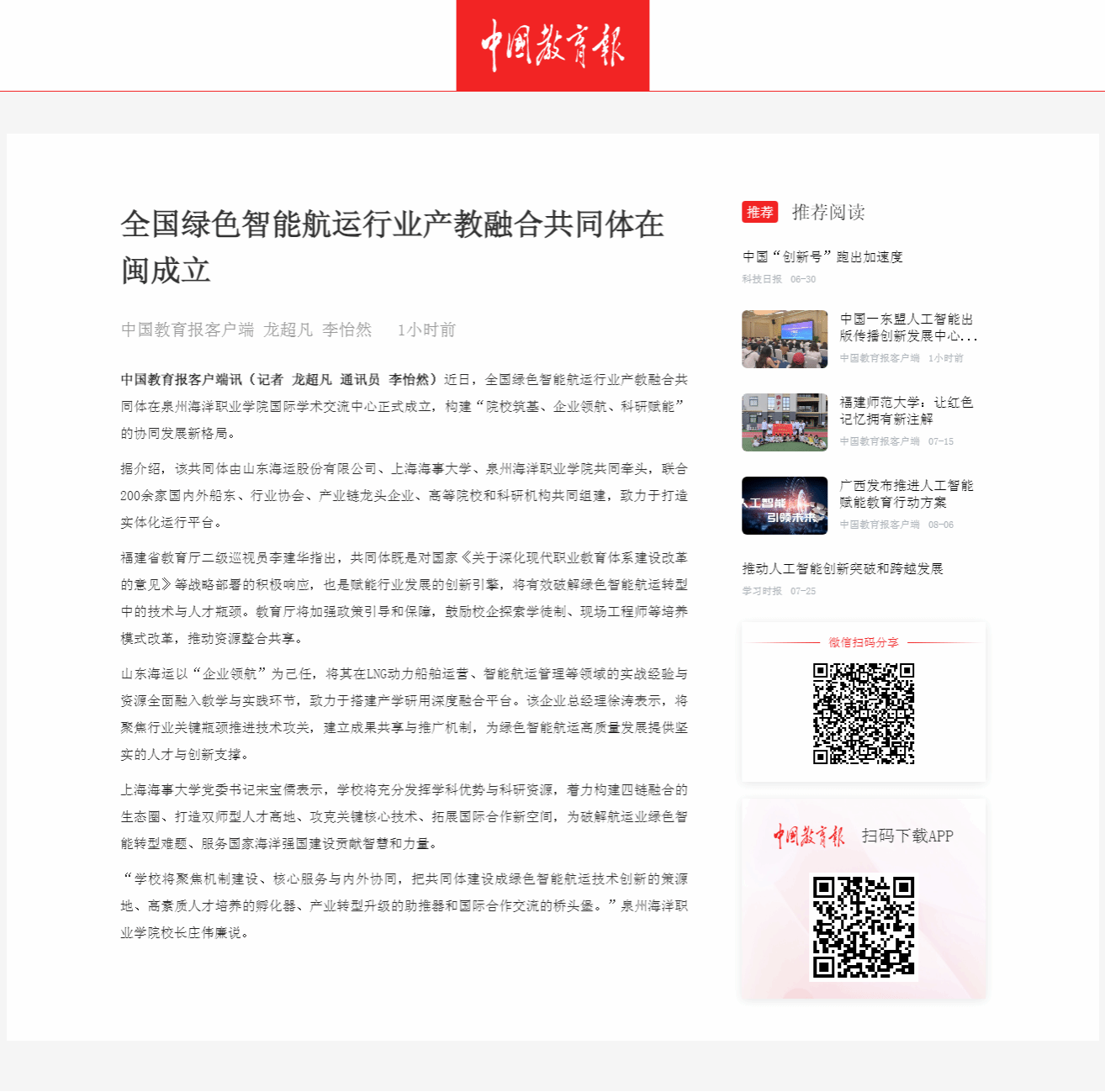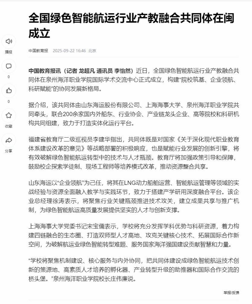 【中国教育报客户端】全国绿色智能航运行业产教融合共同体在闽成立