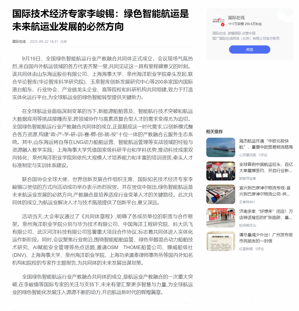 【人民网客户端】全国绿色智能航运行业产教融合共同体成立