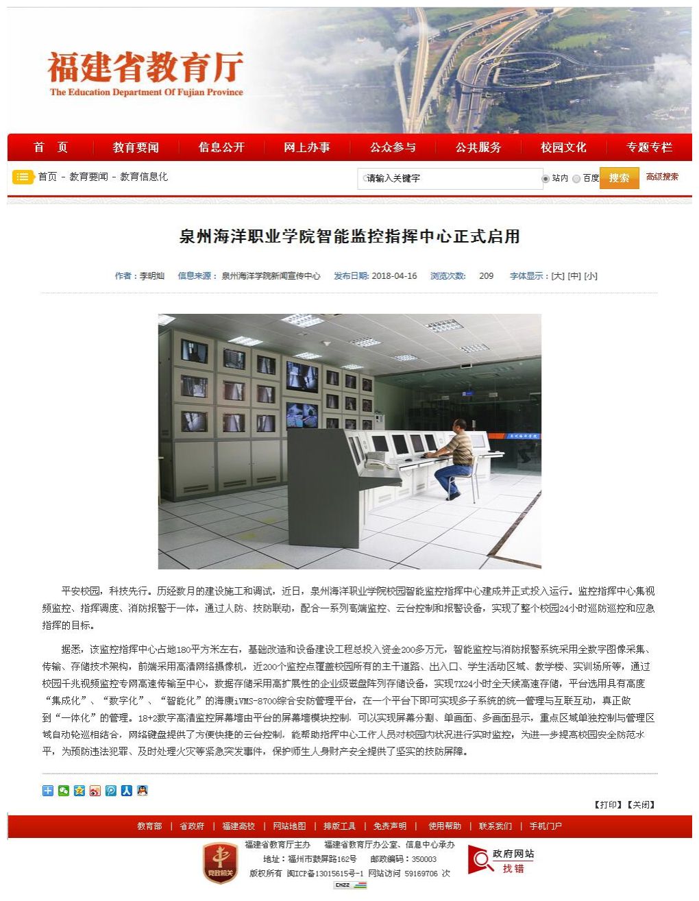 石狮教育报报讯 经过数月的建设施工和调试,近日,泉州海洋职业学院校园智能监控指挥中心正式建成并投入运行。该监控指挥中心集视频监控、指挥调度、消防报警于一体,通过人防、技防联动,配合一系列高端监控、云台控...