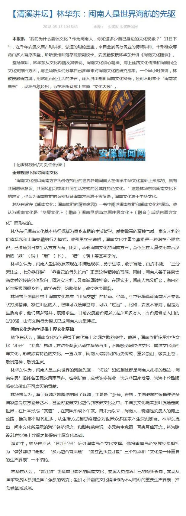 近日,学院院长林华东教授受邀赴具有千年历史的安溪文庙明伦堂参加“清溪讲坛”开讲仪式,并蹬坛授课。林华东教授围绕闽南文化和闽南人在历史海上丝绸之路的地位、影响等话题,为来自安溪县全县各行各业的特聘讲师、...