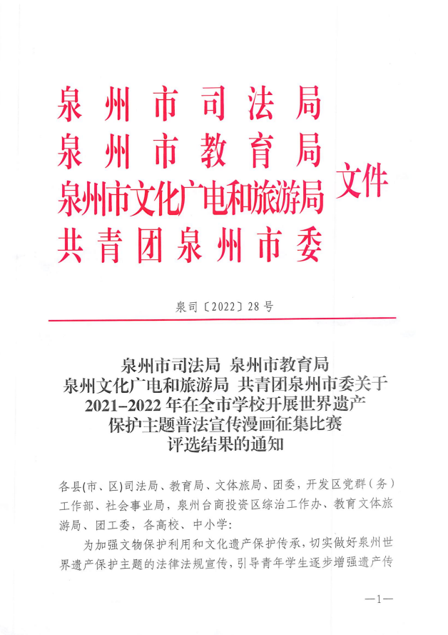 新闻中心讯(党委宣传部报道)近日,2022年泉州市学校世界遗产保护主题普法宣传漫画大赛评选结果发布,泉州海洋职业学院报送的三幅作品从大学组589幅作品中脱颖而出,斩获大学组唯一的1个一等奖和2个三等奖。在前7名...