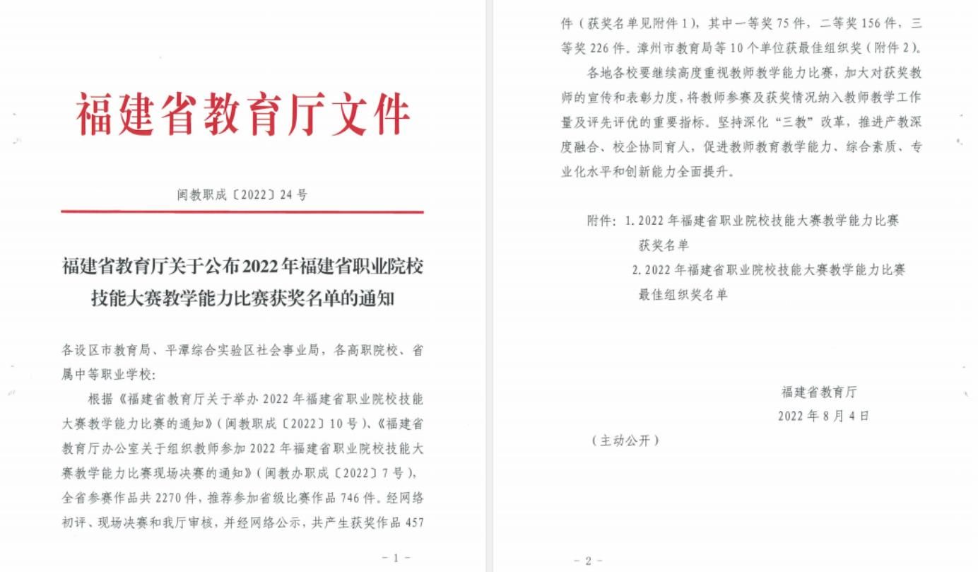 (新闻中心讯 教务处邱妮娜供稿 校党委宣传部报道)近日,福建省教育厅下发《福建省教育厅关于公布2022年福建省职业院校技能大赛教学能力比赛获奖名单的通知》(闽教职成〔2022〕24号),我校胡光灼、吴俊伟、张文生...