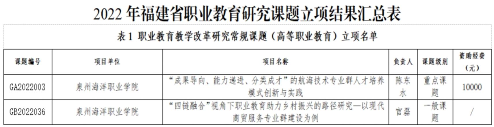(新闻中心讯 科技处魏昱晴供稿 校党委宣传部报道)近日,福建省职业技术教育中心公布了2022年福建省职业教育研究课题立项结果,我校申报两项课题全部喜获立项。陈东水副校长主持的《“成果导向、能力递进、分类成才...