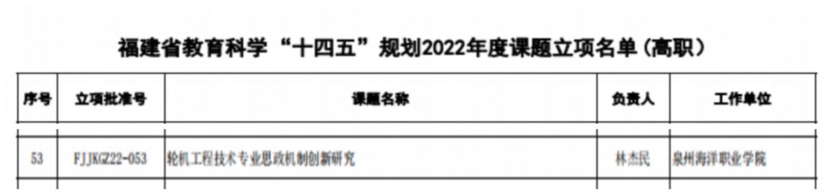 近日,福建省教育科学研究所公布了福建省教育科学“十四五”规划2022年度课题立项结果名单,我校林杰民副院长、副教授主持课题《轮机工程技术专业思政机制创新研究》获批立项;泉州市科学技术局公布了2022年度泉州市...