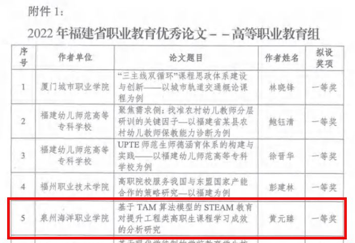 (新闻中心讯 科技处 魏昱晴供稿 校党委宣传部报道)近日,福建省职业技术教育中心公布了2022年福建省职业教育优秀论文获奖名单,我校教师黄元臻、彭正海荣获一等奖。 近年来,我校不断深化教育教学改革,更新...