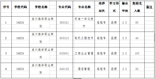 新闻中心讯(柯阿斌供稿 党政办编辑)近日,福建省教育厅下发通知,正式批准我院自2017年起举办高起专成人高等学历函授教育,首批开设机电一体化技术、轮机工程技术、工商企业管理、酒店管理等4个专业,学制2.5年。 ...