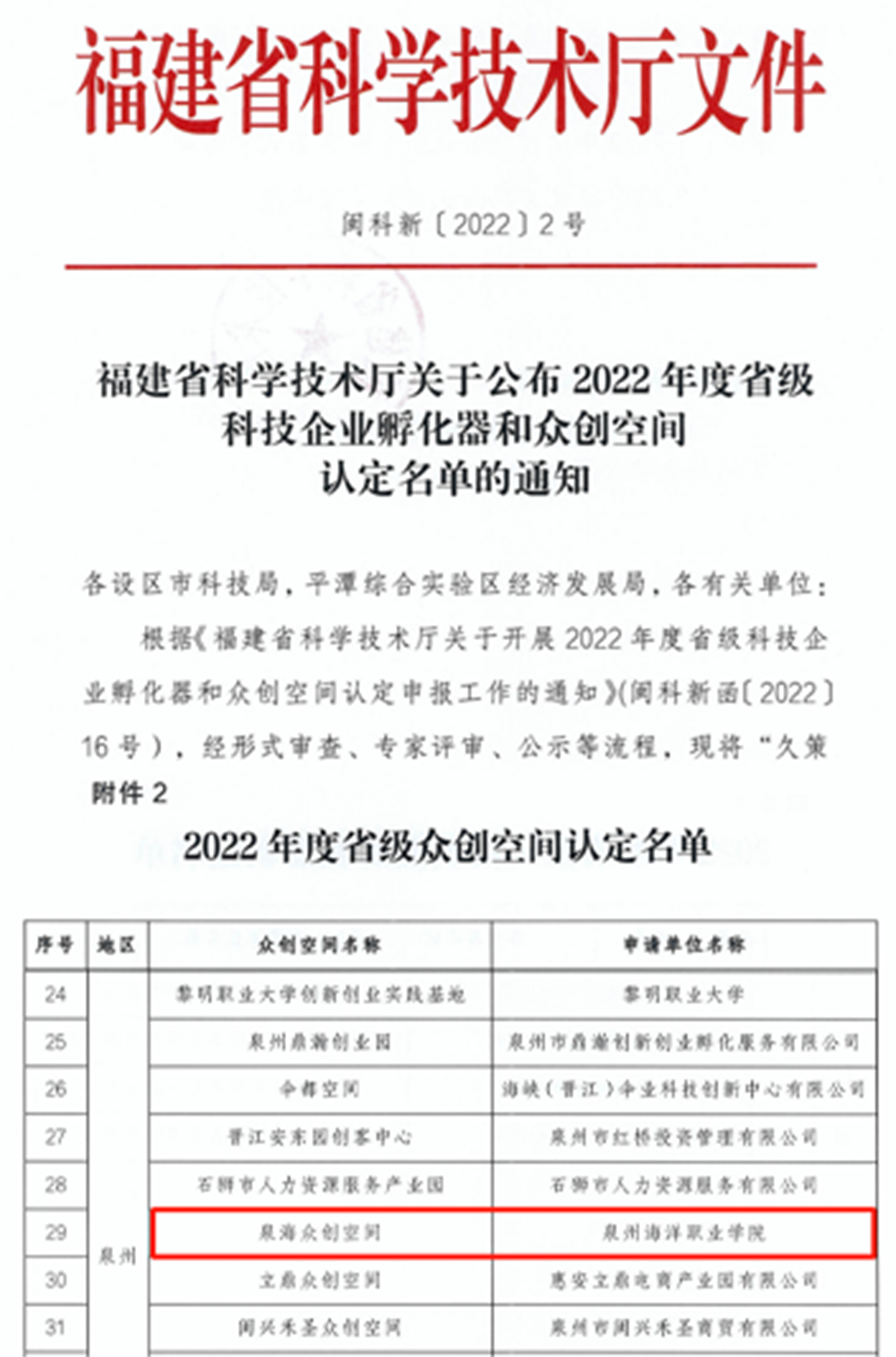 (新闻中心讯 对外合作部郑天明供稿 校党委宣传部报道)近日,福建省科技厅公布2022年度省级科技企业孵化器和众创空间认定名单,我校泉海众创空间(三创基地)榜上有名,喜提“省级众创空间”新名片。 目前,泉...
