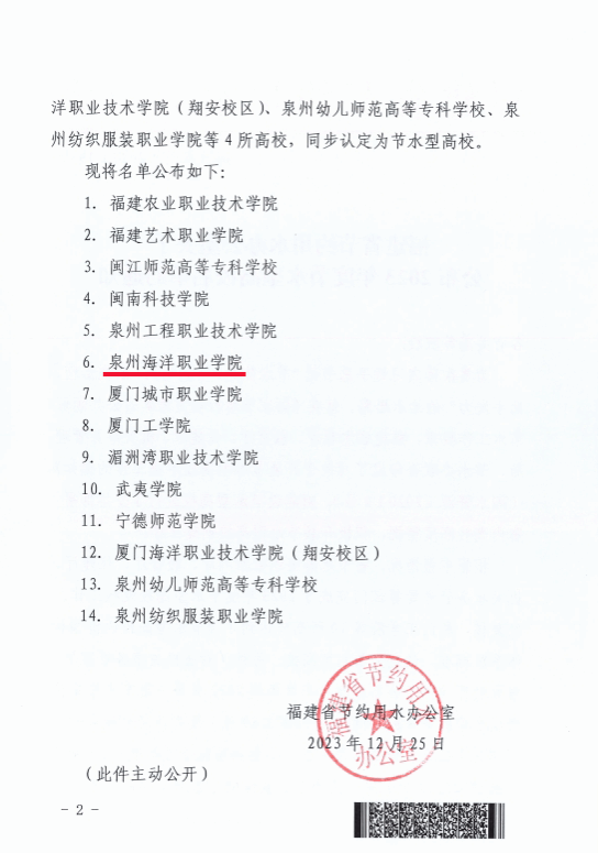 (新闻中心讯 后勤处供稿 校党委宣传部报道)日前,福建省节约用水办公室公布了2023年度省级节水型高校名单(闽节水函[2023]19号文)。泉州海洋职业学院经福建省节水办组织省水利厅、教育厅、住建厅、机关事务管理局...
