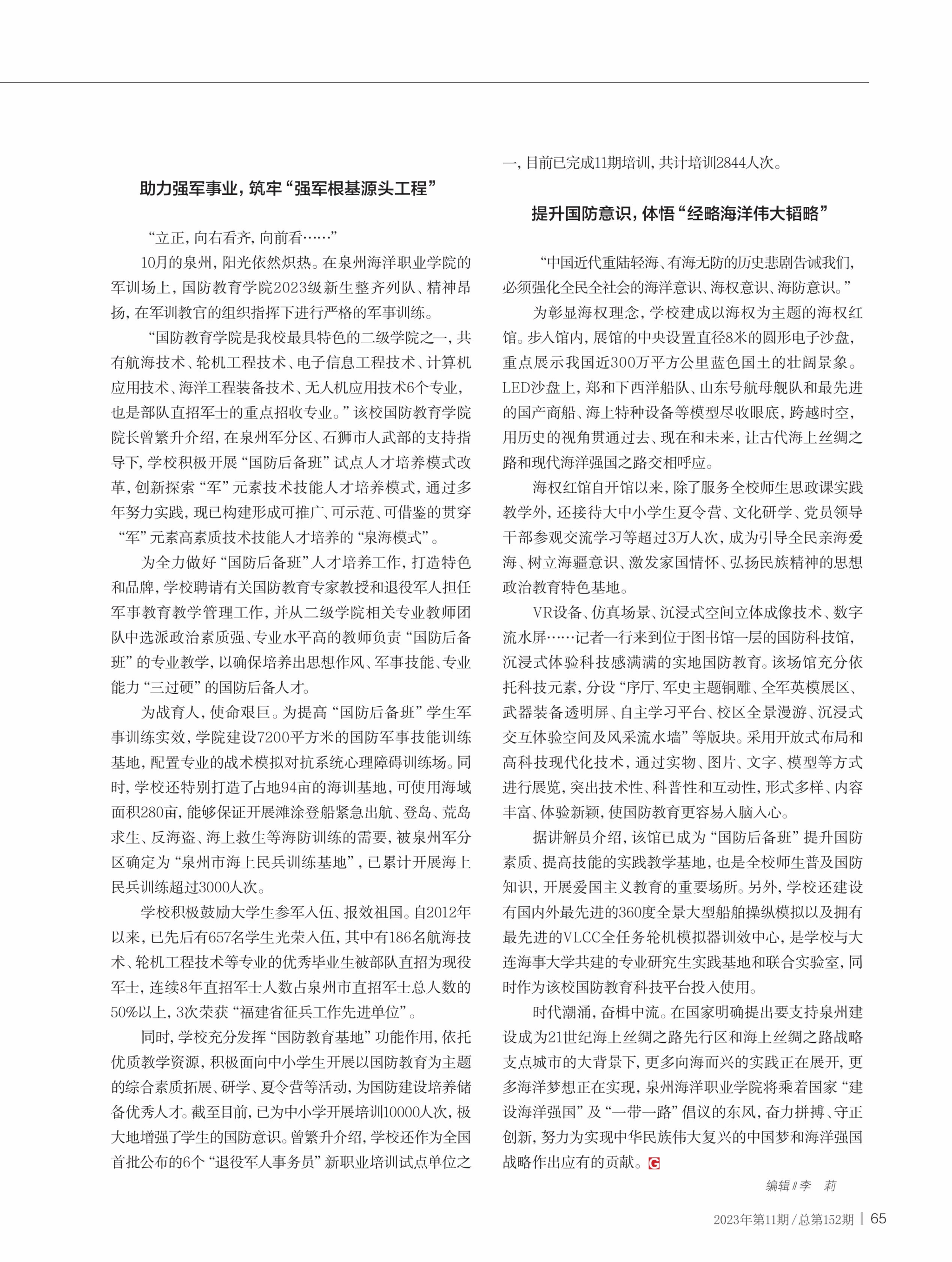 (新闻中心讯 校党委宣传部报道)近日,中国军网、《国防教育》杂志以《向海图强勇担当——泉州海洋职业学院大力开展国防教育纪实》为题,对我校国防教育特色成果进行刊登报道,引发广泛关注。 《国防教育》是由国家...