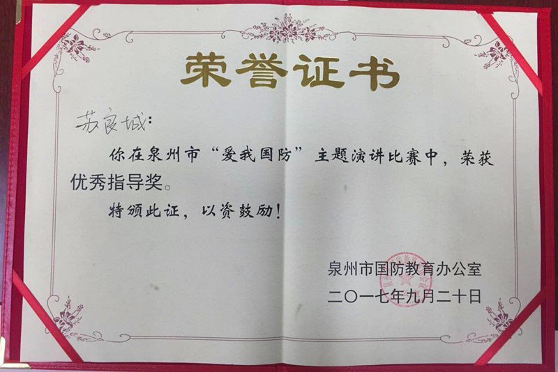 新闻中心讯(李阳供稿 党政办编辑)2017年9月24日,由泉州市国防教育部门主办,泉州师范学院承办的以“爱我国防”主题演讲比赛,在泉州师范学院大礼堂盛大召开。我院16级学子陈华代表石狮市参加了比赛,并最终脱颖而出...