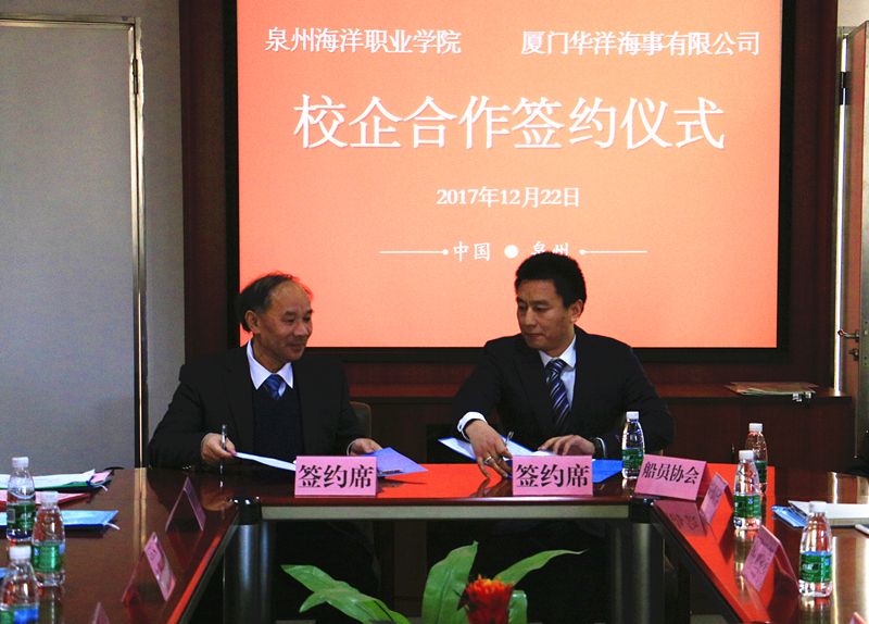 新闻中心讯(党政办编辑)近日,在我院承办福建省船员服务行业协会换届大会之际,我院与厦门华洋海事有限公司校企合作协议在我院举行。学院林华东院长与厦门华洋海事有限公司胡从池总经理分别代表双方签署校企合作协...
