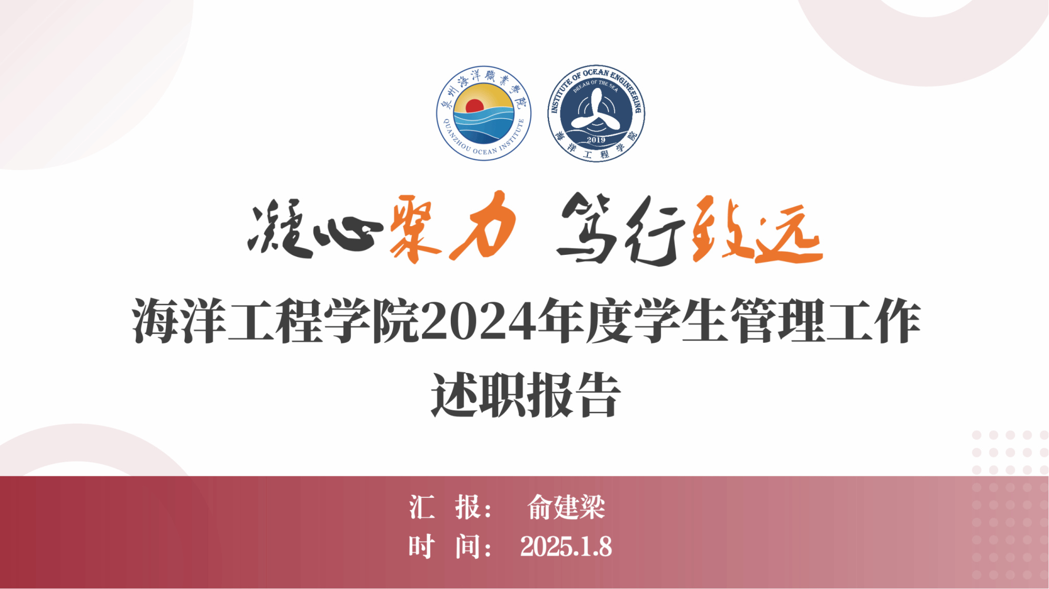 【新闻中心讯 人事处(教师发展中心、党委教师工作部) 党委宣传部报道】1月8日,泉州海洋职业学院在图书馆报告厅召开年度述职报告会暨2025年度任务书签订仪式,全面总结过去一年的工作成果,共同展望未来发展蓝图。校领导、中层干部参加。此次会议旨在加强校内各单位之间的交流与协同,进一步提升领导能力和管理水平,为学校的发展规划奠定坚实基础。会议由人事处处长周双英主持。会上,各单位负责人依次登台述职。各二级学院负责人以详实的数据和丰富的案例,...