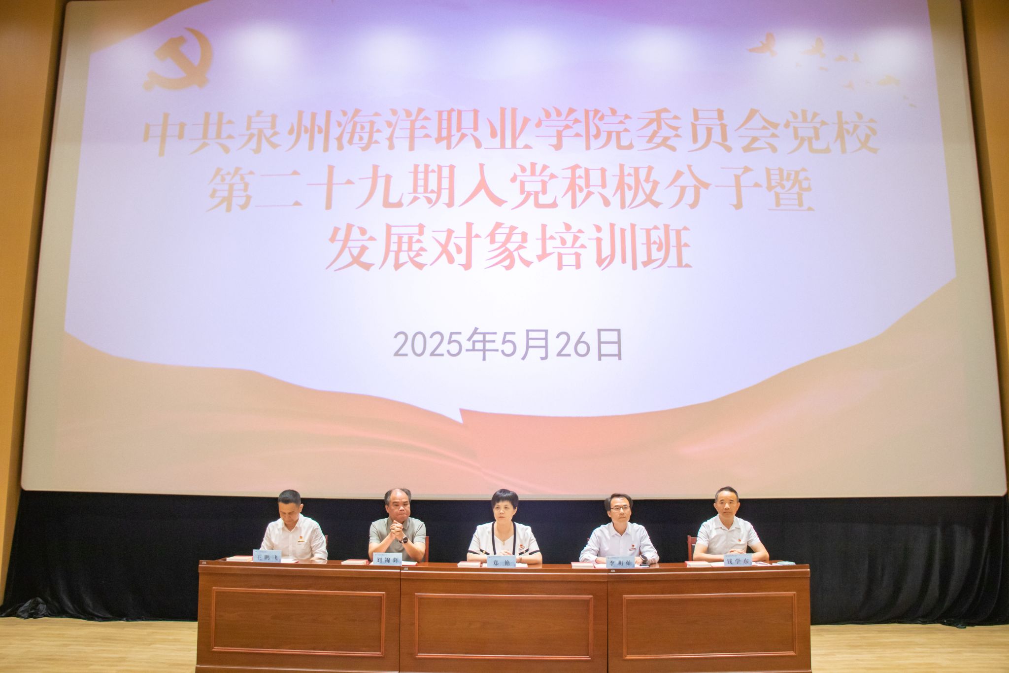 (新闻中心讯 党委组织部供稿 党委宣传部报道)5月26日上午,中共泉州海洋职业学院委员会党校第二十九期入党积极分子暨发展对象培训班开班仪式在图书馆二楼学术报告厅举行。党委委员、党委职能部门负责人、各基层党组织书记、校团委负责人、党校授课教师及全体培训班学员齐聚一堂,共同开启此次培训征程。本次开班仪式由党委组织部副部长吴为灼主持。开班仪式在庄严的国歌声中拉开帷幕。党委组织部部长黄玲玲宣读了《关于表彰2024-2025学年优秀学生党建助理的决定》...