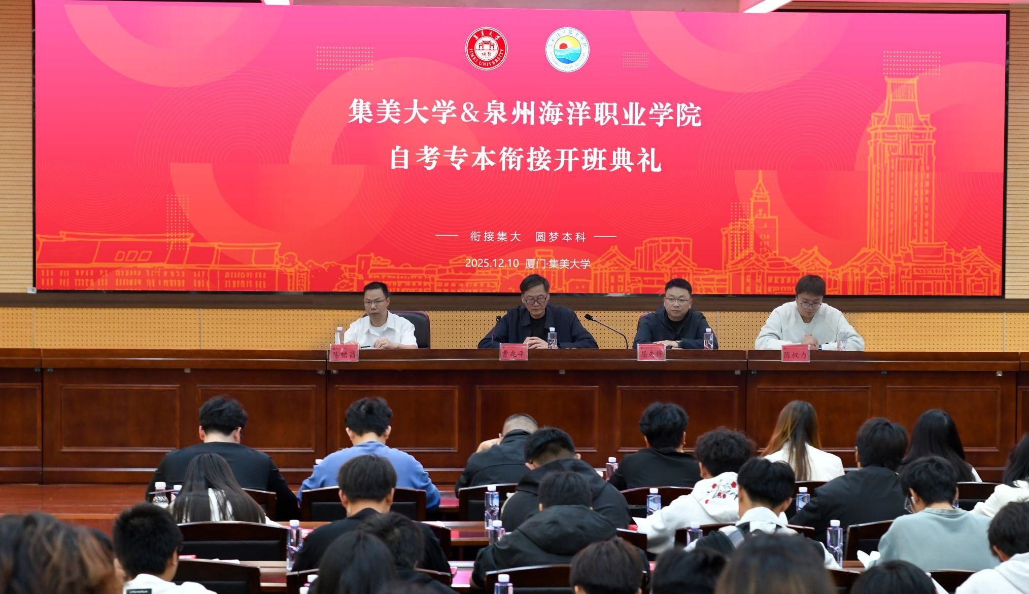 (新闻中心讯 继续教育学院供稿 党委宣传部报道)12月10日,我校与集美大学合作开设的自考专本衔接2510期开班仪式暨表彰大会,在集美大学尚大楼103会议厅举行。集美大学继续教育学院院长曹兆平、学历办主任陈铭昌及相关教师,我校继续教育学院副院长屈先锋、学历办负责人、辅导员代表,以及该批次全体新生共同参会。集美大学继续教育学院院长曹兆平在致辞中介绍了集美大学“嘉庚精神立校,诚毅品格树人”的办学理念,及该校的办学特色与人才培养目标。...