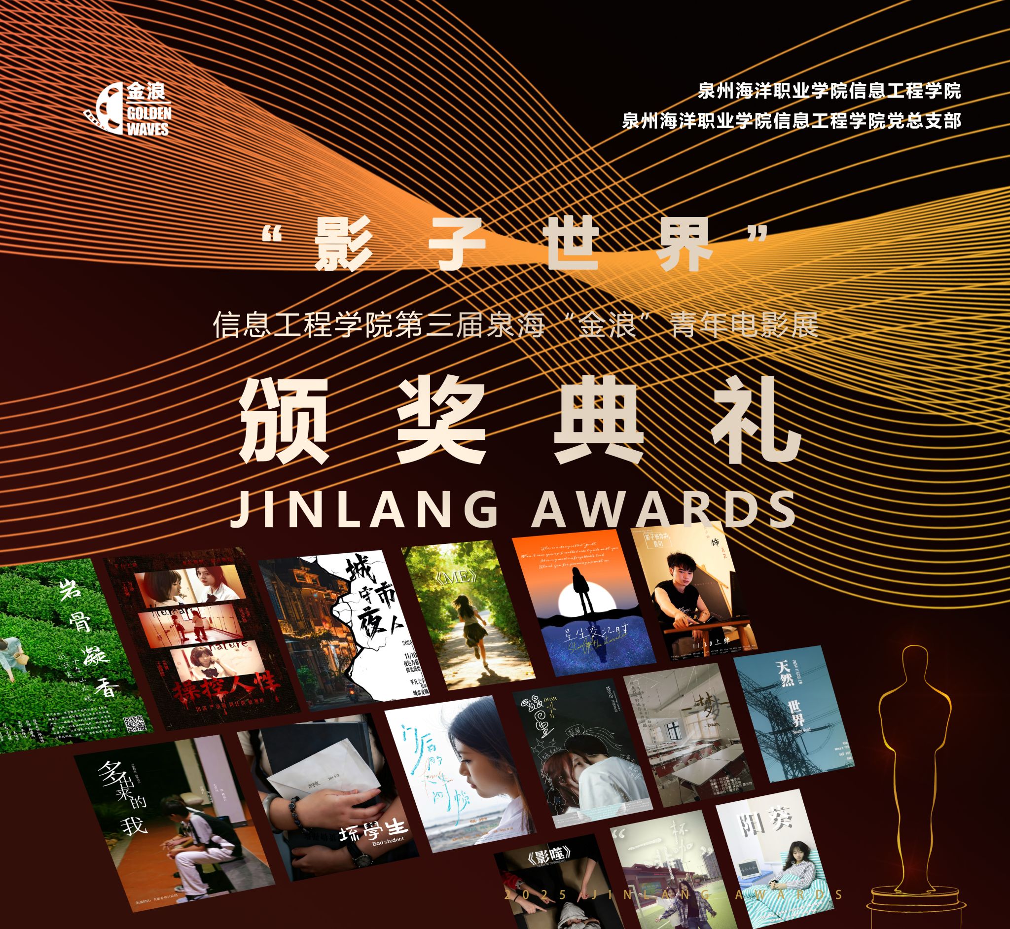 当灯光渐暗,银幕亮起12月17日的国际学术交流中心大礼堂属于电影更属于每一个心怀光影的你泉海第三届“金浪”青年电影展颁奖典礼在所有人的注视与期待中燃情开幕这里,是青春的影画,是故事的海洋由信息工程学院主办的“金浪”青年电影展已陪伴我们走过三载时光它始终秉持“探索世界,分享故事”的朴素宗旨坚持“大学生创办、大学生观看、大学生评判”这方舞台永远为年轻的表达而设今年“金浪”以 “影子世界”为主题像一扇虚掩的门邀请创作者走进记忆的缝隙与内心的宇宙在50余部投稿中最终有15部作品脱颖而出、...