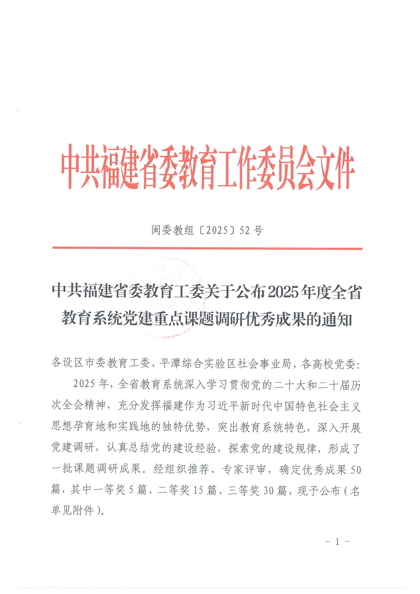 (新闻中心讯 党委组织部供稿 党委宣传部报道)近日,中共福建省委教育工作委员会公布了2025年度全省教育系统党建重点课题调研优秀成果评选结果,我校经济管理学院党支部课题组(成员:林钊、陈滨彬、洪婉婷)完成的党建研究成果——《海洋强国意识融入大学生思想政治教育调查研究——基于全国八省(市)与福建泉州的对比分析》荣获三等奖。本次评选共确定优秀成果50篇,我校是泉州地区唯一入选的民办高职院校,标志着我校在党建理论研究与实践探索方面取得了重要突破。...